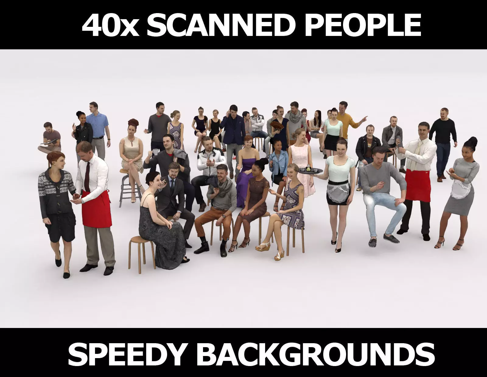 If you are on a budget, but need to quickly populate big 3d-scenes with scanned people - the Treapl FORTIES SPEEDY BACKGROUND characters are the ideal match for you.