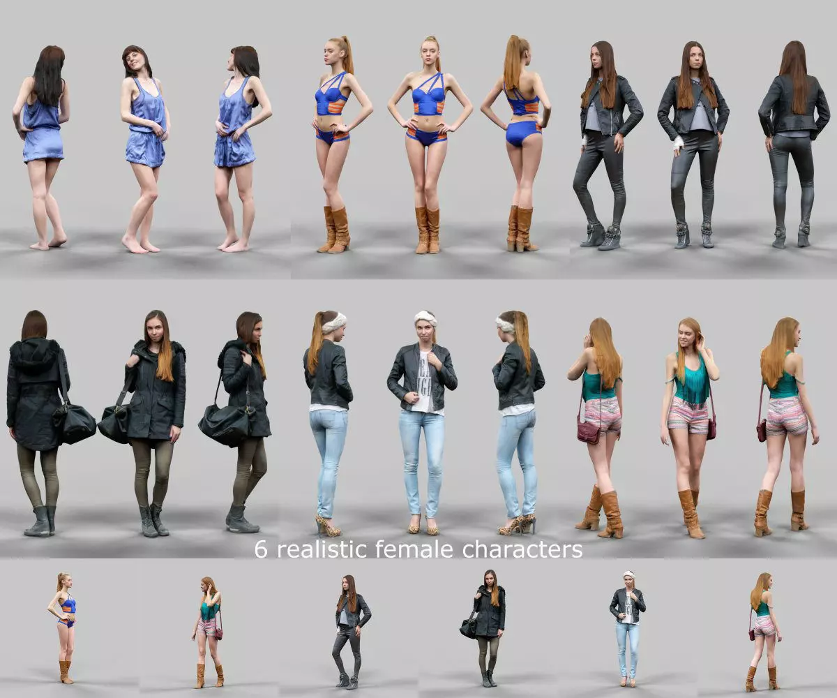 High quality, 3D scanned Female character collection. Scanned using photogrammetry for acurate and detailed representation of fabric and skin.