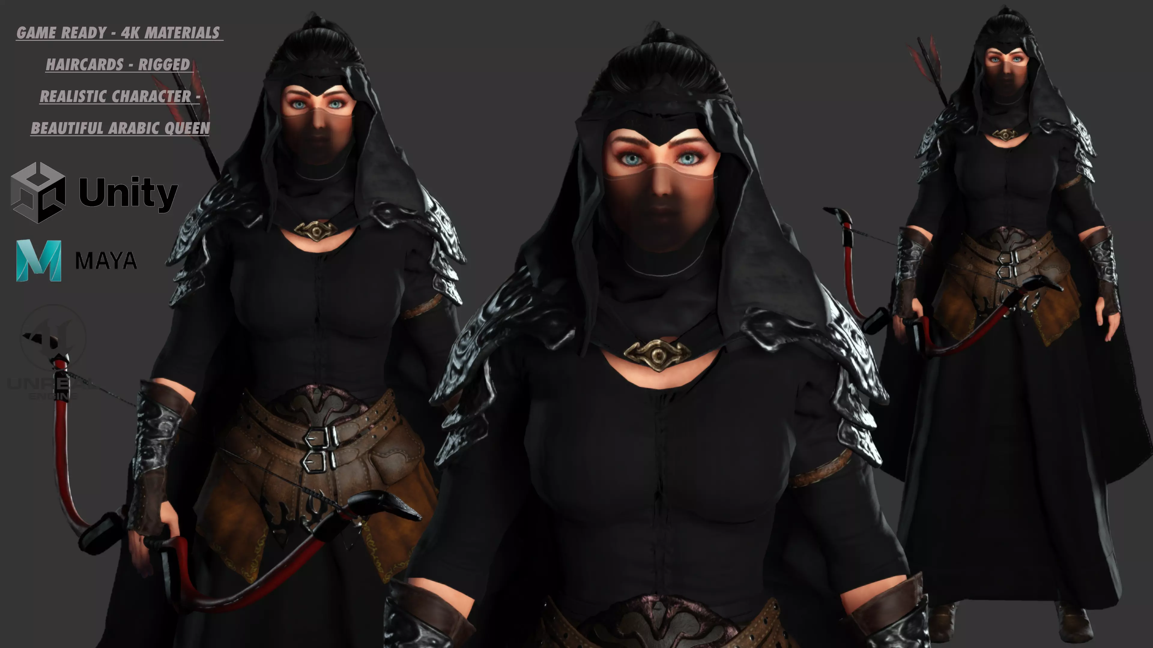 Female, Light skin Female , Beautiful / Realistic Arabic Face, Ponytail hair, Blue eyes, Dark hair, Fit Body, Tall, Good shape body, Warrior/Assassin/Queen
