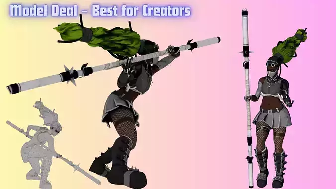 Meet the ultimate survivor. This high-quality 3D character model features a stylized post-apocalyptic female warrior equipped with a custom tactical staff. With a unique green top-knot hairstyle, mesh stockings, and rugged combat gear, this model is perfect for sci-fi, cyberpunk, or fantasy game projects.