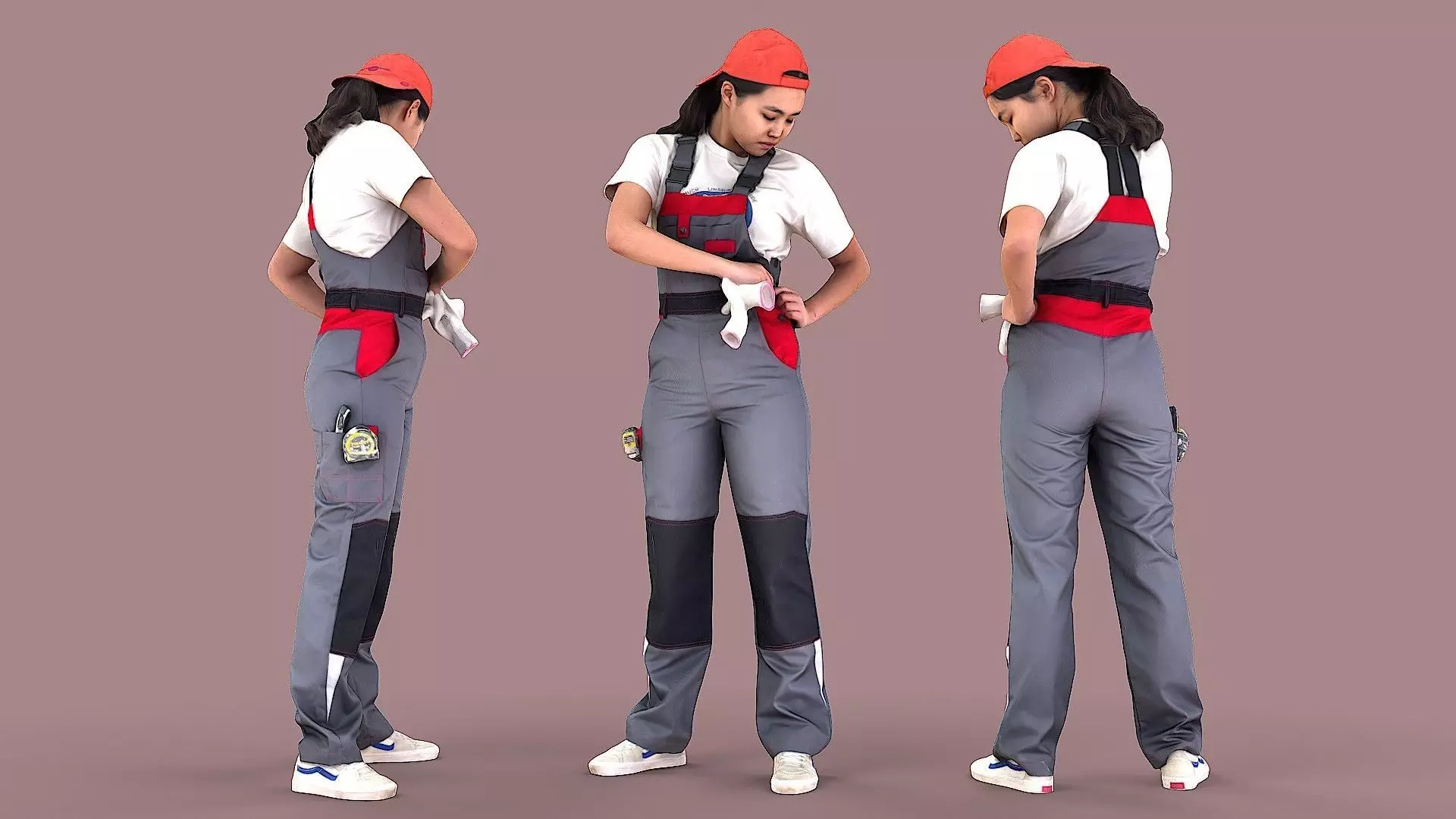 A young Asian woman fastens the side buttons of her working overalls while holding a pair of clean white gloves. She is dressed in a white T-shirt, an orange cap, light-colored sneakers, a gray-red jumpsuit with a tool and a tape measure in the side pocket.