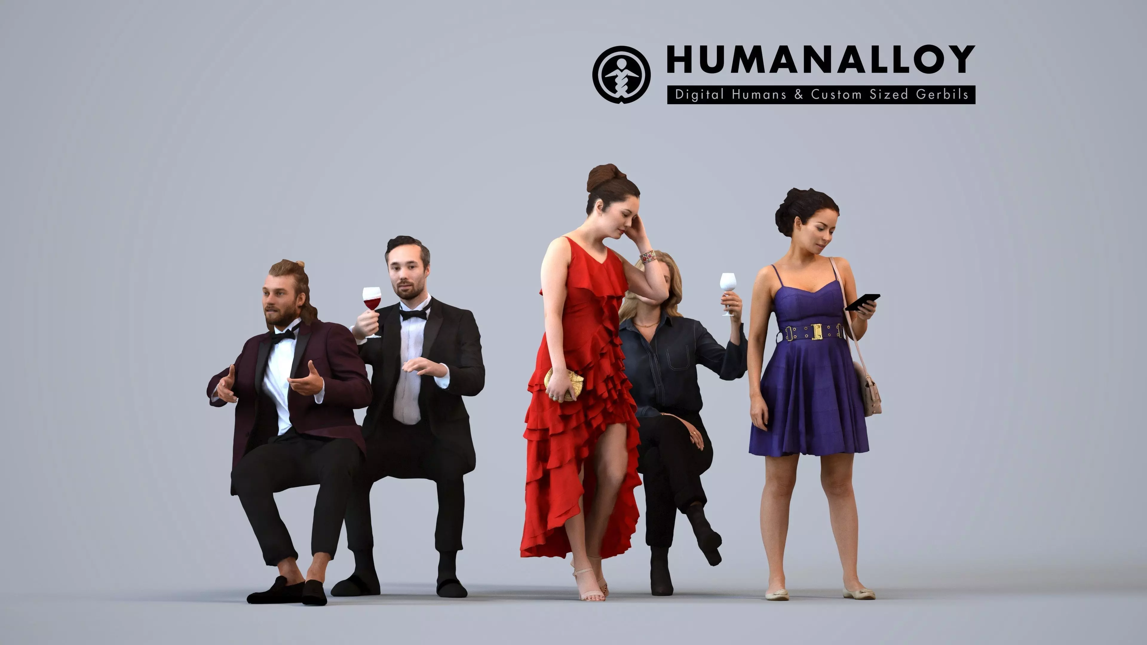 A set containing 5 models of male and female adults sitting in formal attire in restaurants or parties.
