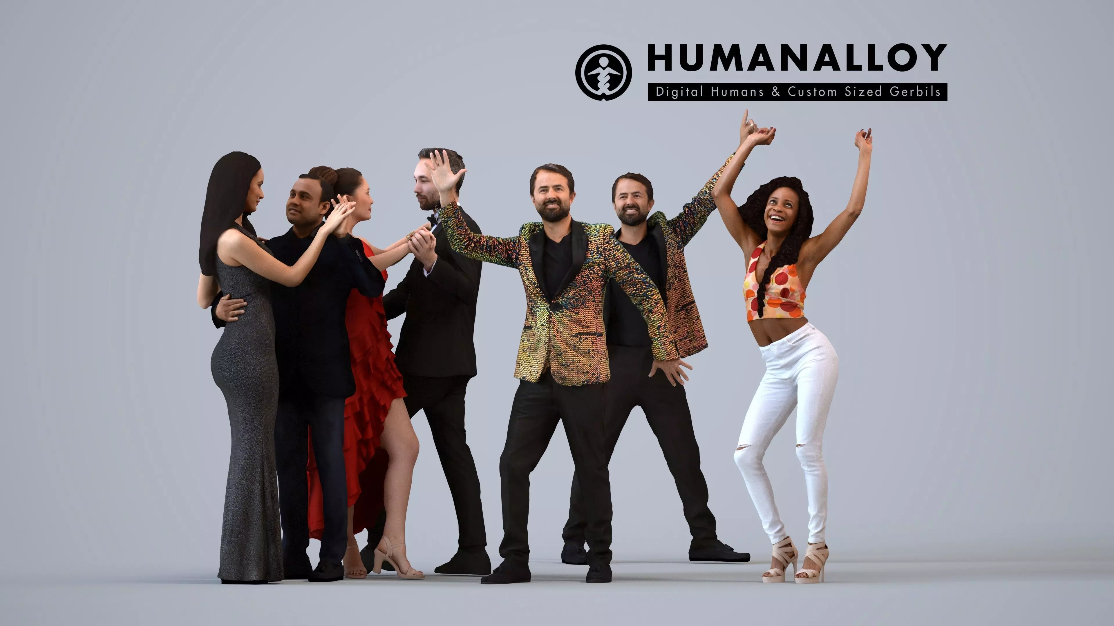 A set containing 5 models of male and female adults in formal attire dancing in a restaurant or a party..