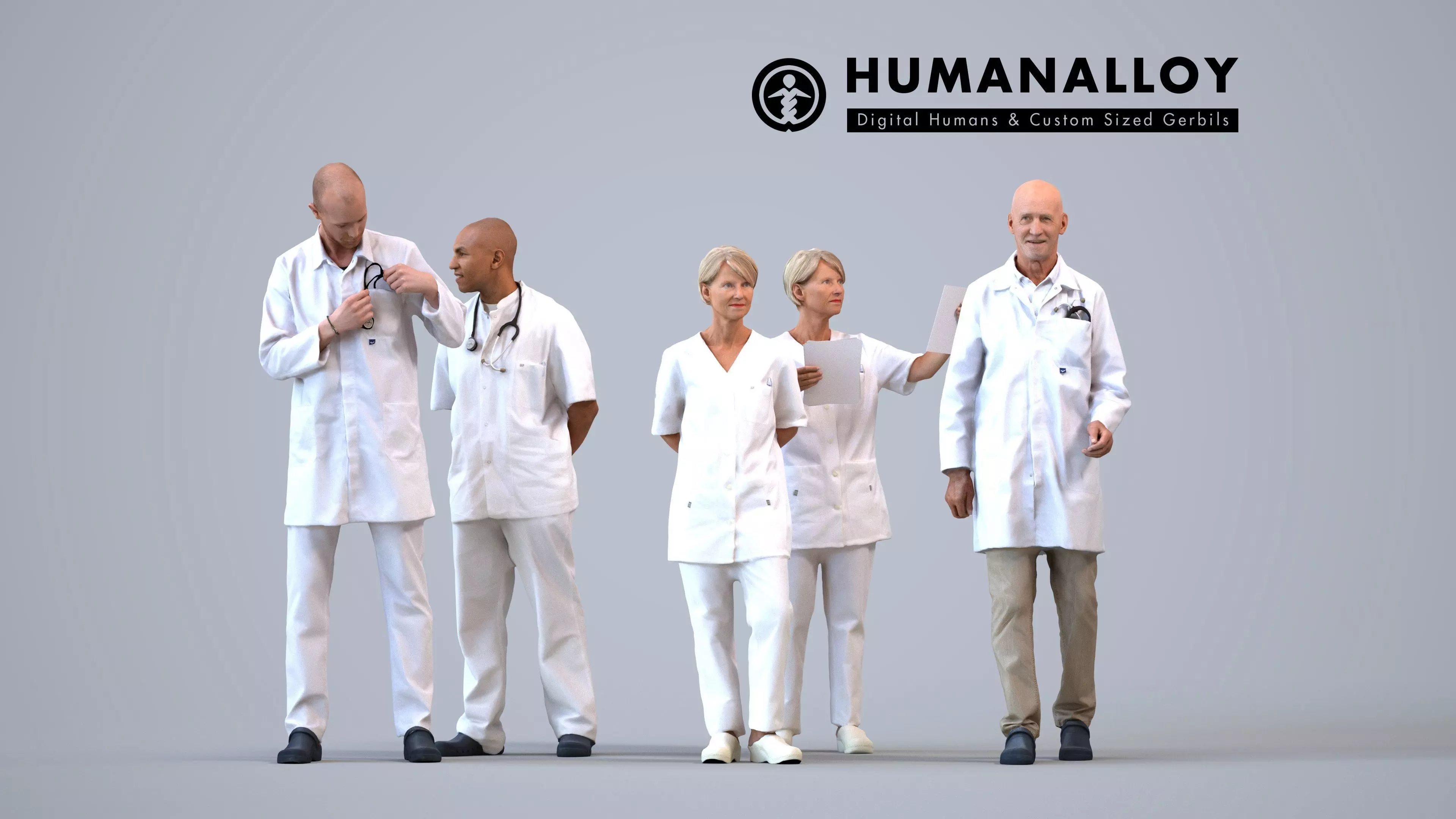 A set containing 5 models of male and female seniors standing working in the medical profession as doctor and nurse.