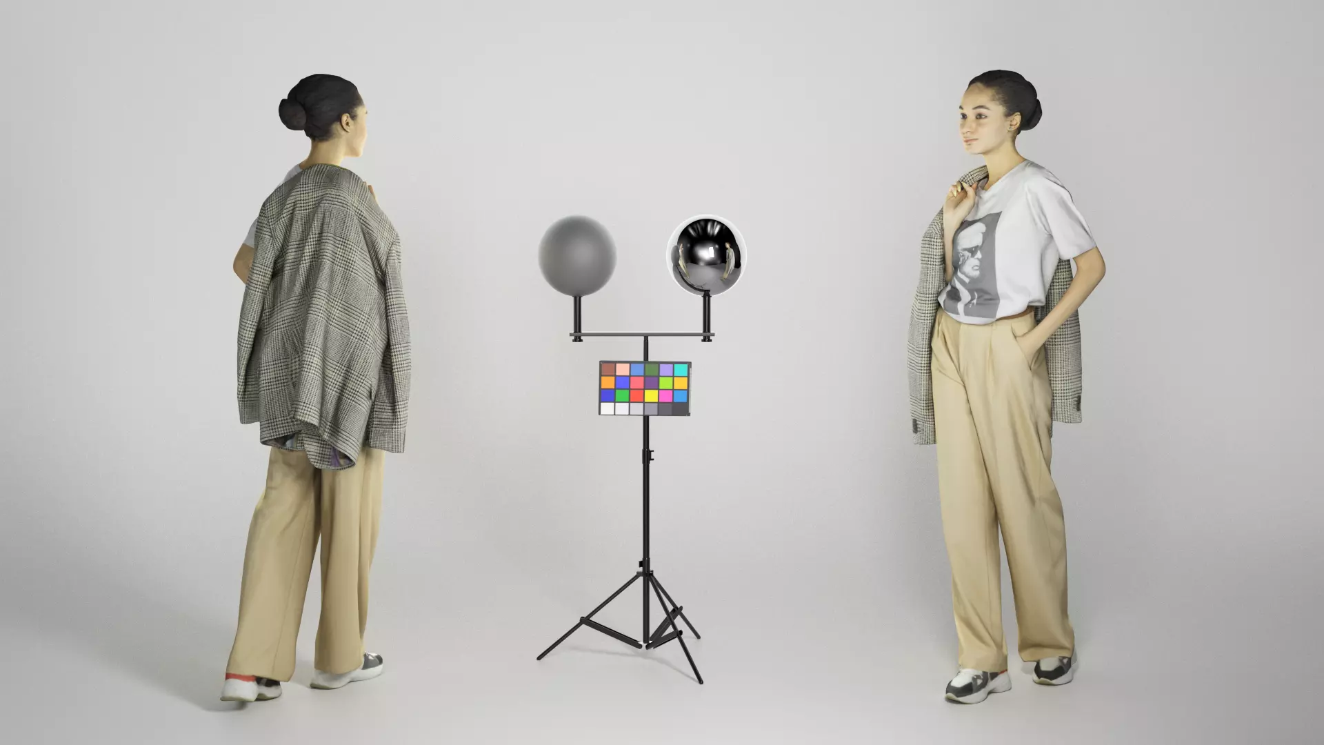 This is a true human size and detailed model of a attractive young woman of Caucasian appearance dressed in casual style. The model is captured in casual pose to be perfectly matching to variety of architectural visualization, background character, product visualization e.g. urban installations, city designs, outdoor design presentations, VR/AR content etc.
