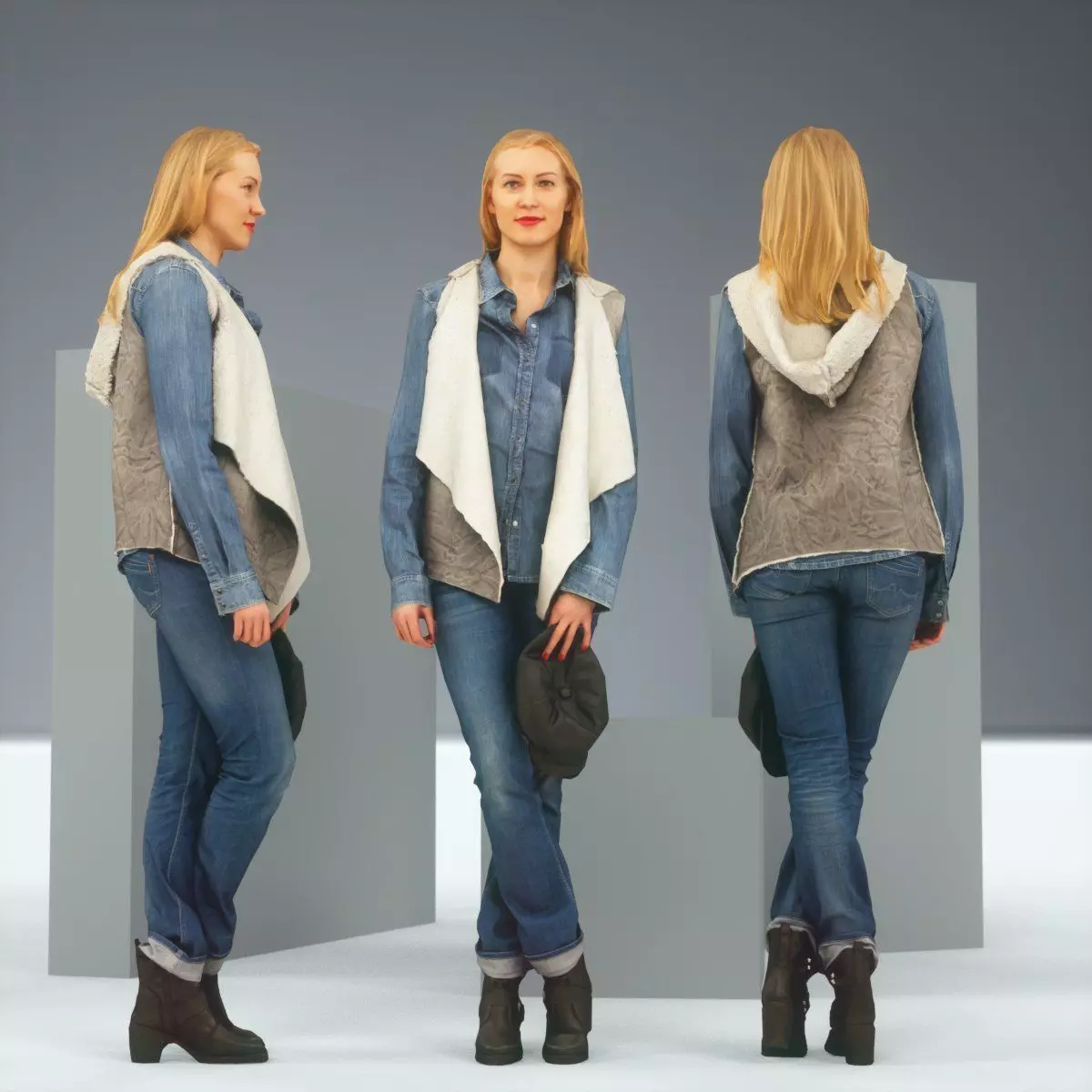 Realistic 3D Scanned Female Model Posing.: Blonde Model in Jeans Outfit holding Cap