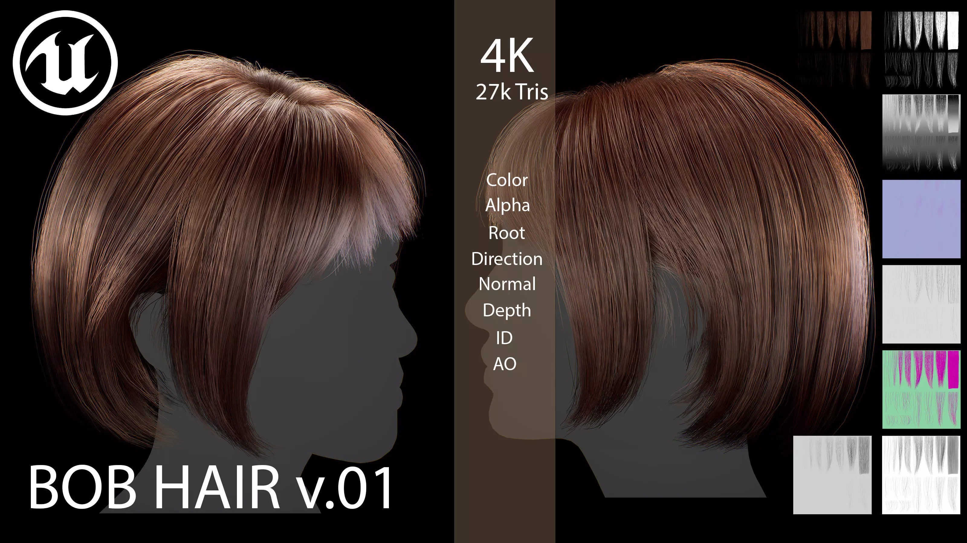 This elegant real-time female Bob hairstyle is designed for use in games, cinematics, and real-time applications. Hair textures created with XGen (textures were made and baked using xGen and Arnold) and optimized for Unreal Engine 4-5, this asset delivers both performance and high visual quality.