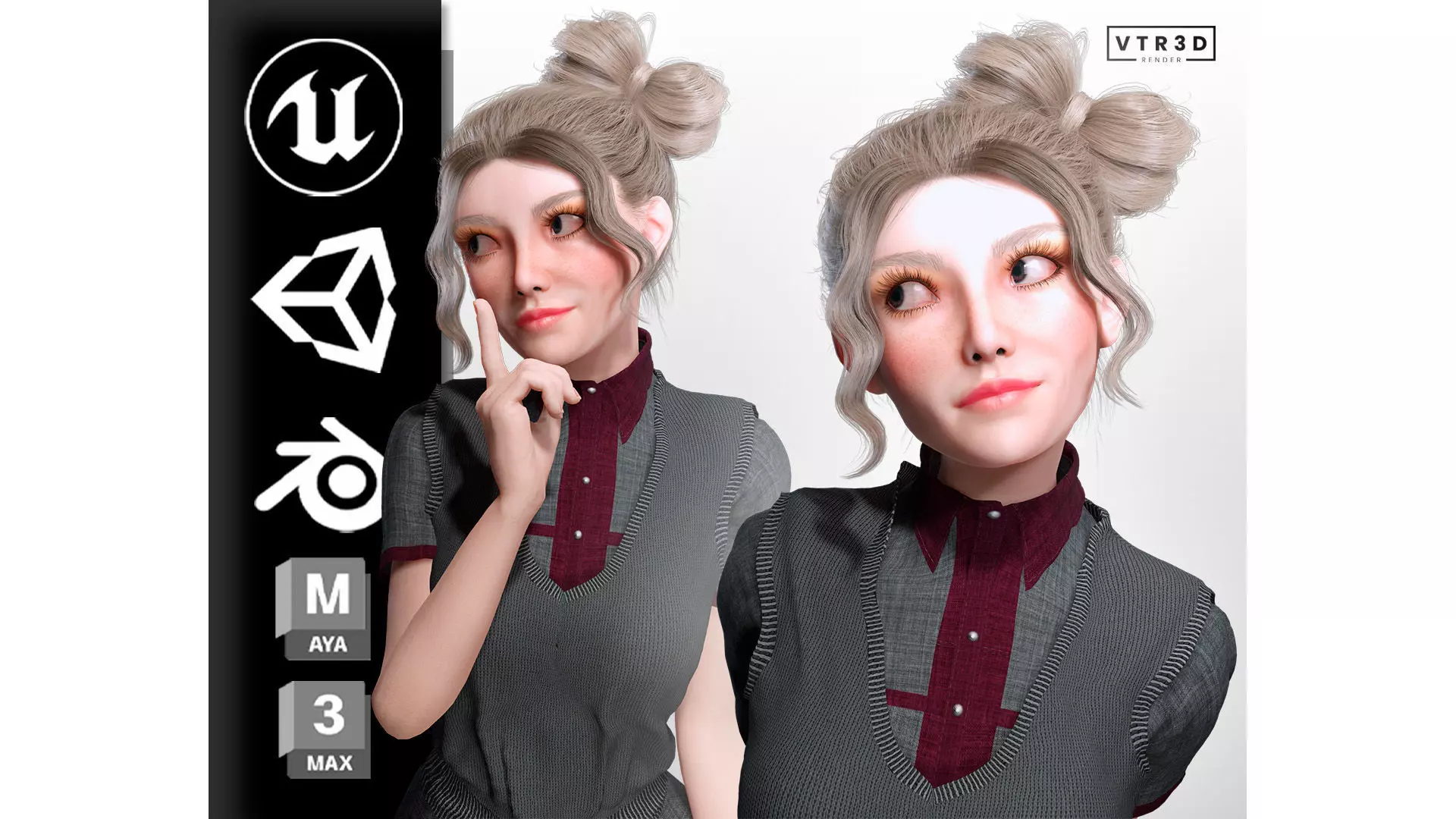 The hairstyle is designed with twin buns and loose front strands, giving the character a distinctive and playful identity. The school-inspired outfit includes layered garments with realistic fabric folds and detailed material definition, ensuring visual authenticity in both close-up and full-body shots.