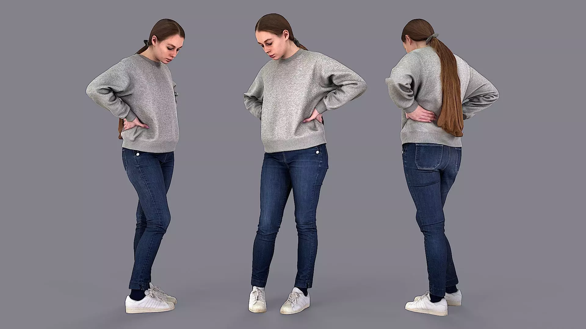 The 3D model captures a young woman standing with a casual yet confident posture. With one leg slightly bent and hands on her hips, she exudes a relaxed vibe while attentively looking down, possibly listening or waiting for someone. Her outfit is comfortably casual, featuring a gray sweatshirt paired with dark blue jeans and white sneakers. Her waist-length hair, pulled back into a ponytail, accentuates her youthful appearance.
