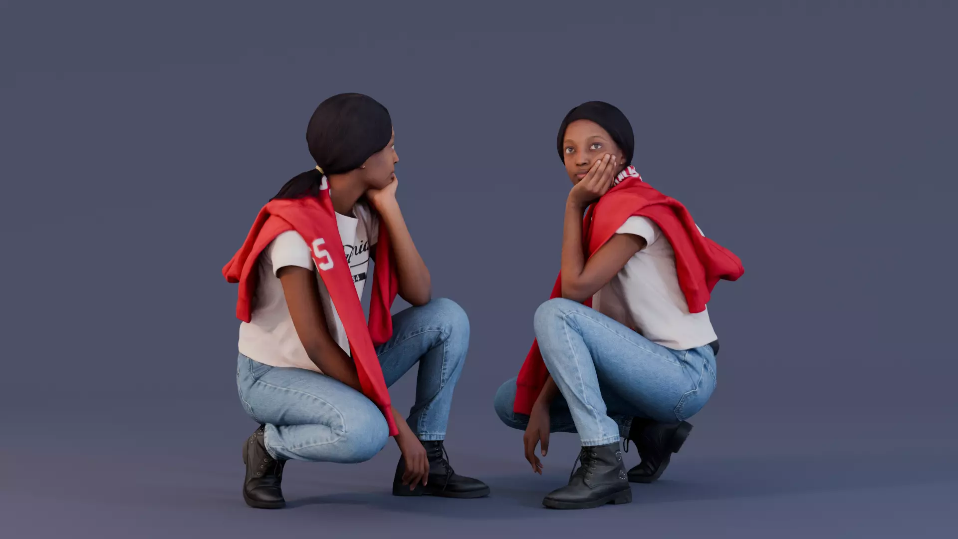This 3D model depicts a young woman casually crouching while dressed in a laid-back outfit. She is wearing a white graphic t-shirt, light blue jeans, and black boots, with a red jacket draped over her shoulders. The model captures a thoughtful, relaxed pose, making it ideal for use in urban, casual, or social settings.