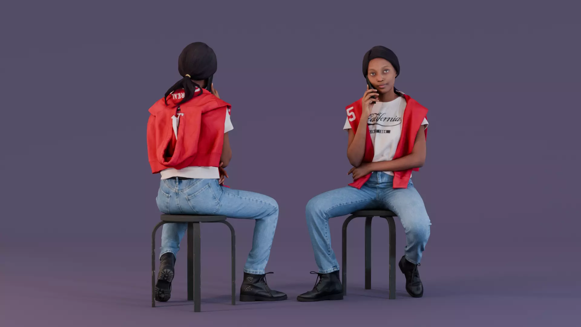 This photorealistic 3D model showcases a young woman sitting on a chair, engaged in a relaxed phone conversation. She is dressed casually in light blue jeans, a white T-shirt with California printed on it, and a red hoodie casually draped over her shoulders. The model's body language and casual attire make her perfect for representing modern, everyday scenarios. The scene can depict a laid-back moment where she might be chatting with a friend or waiting in a public space.