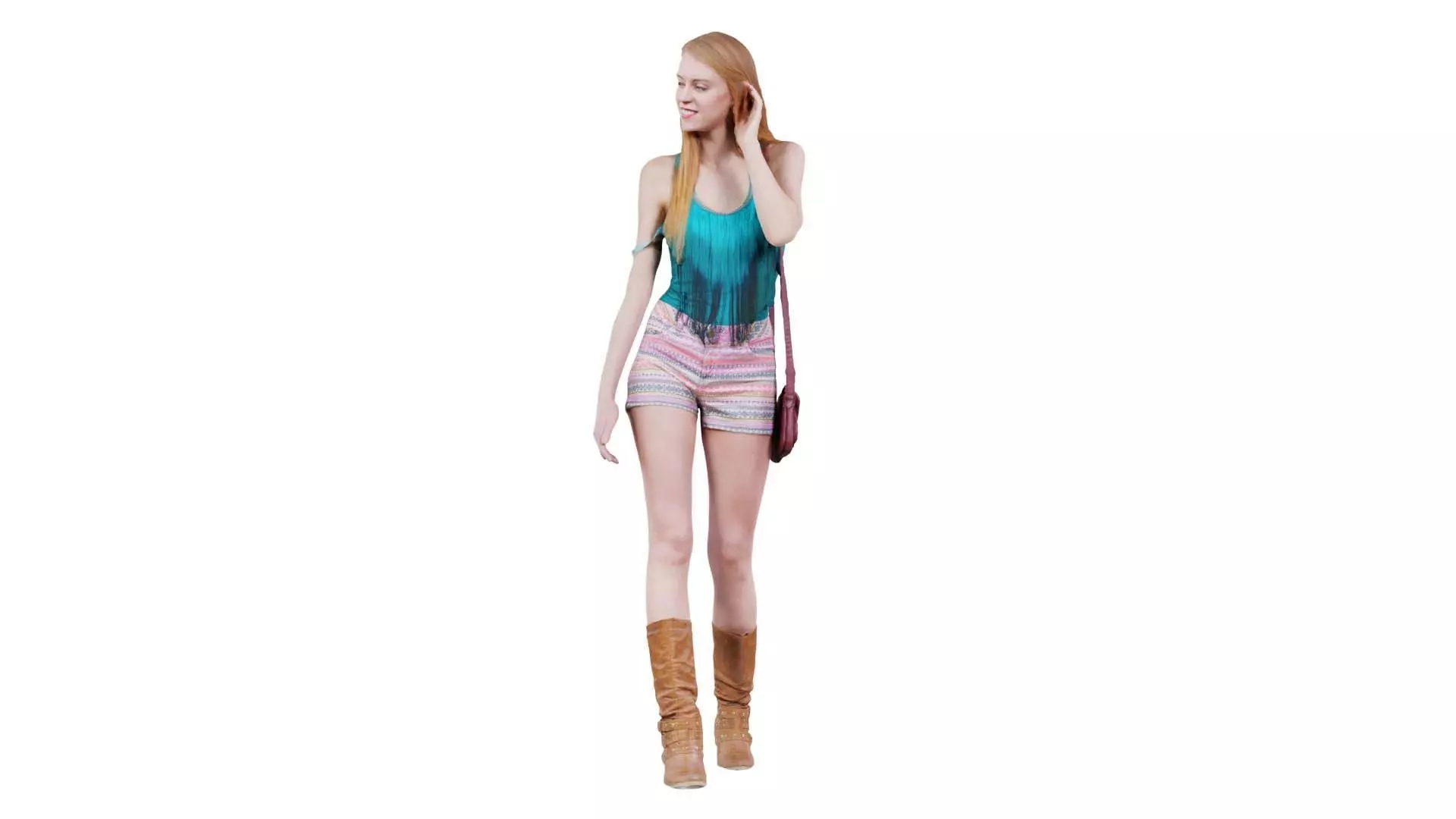 Polygonal Miniatures presents casual woman in boots colorfull shorts and green top walking, a model from our 3D scanned catalogue. The model, a woman in shorts and a top is walking, is obtained by photogrammetry, and scanned using SLR camera's.Processing takes place in Zbrush and Photoshop and the resulting 3D model has unwrapped, non overlapping UV's, and a texture and normal map. Before publishing, we make sure the model has real world scale (meters), correct shader setup and is centered at the origin.Apart from the various file formats, we also offer a Blender file with material and textures set-up, ready for export and rendering. More info can be found below: