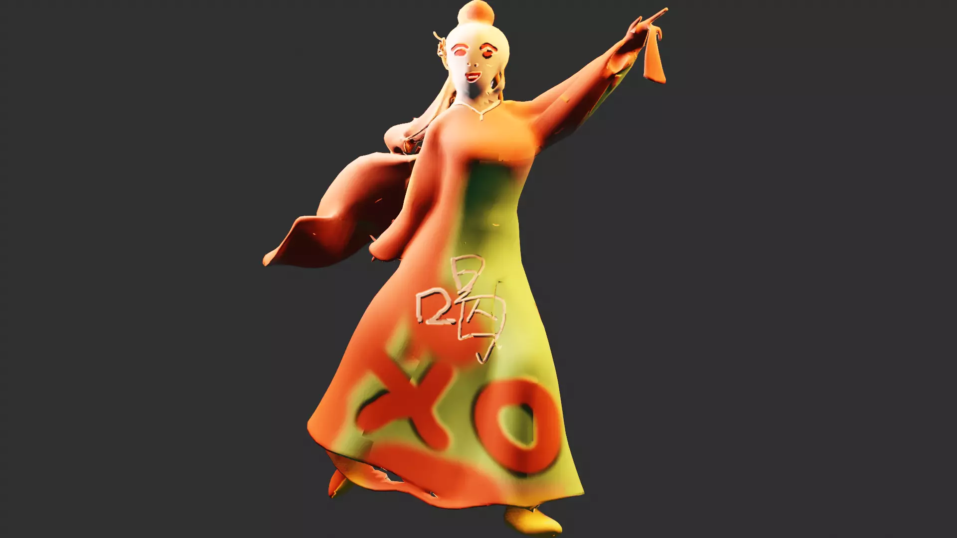 Model building process: mostly by loop tool, not by modifying default object in Blender, Chinese script attached on tree body by using shrinkwrap modifier
