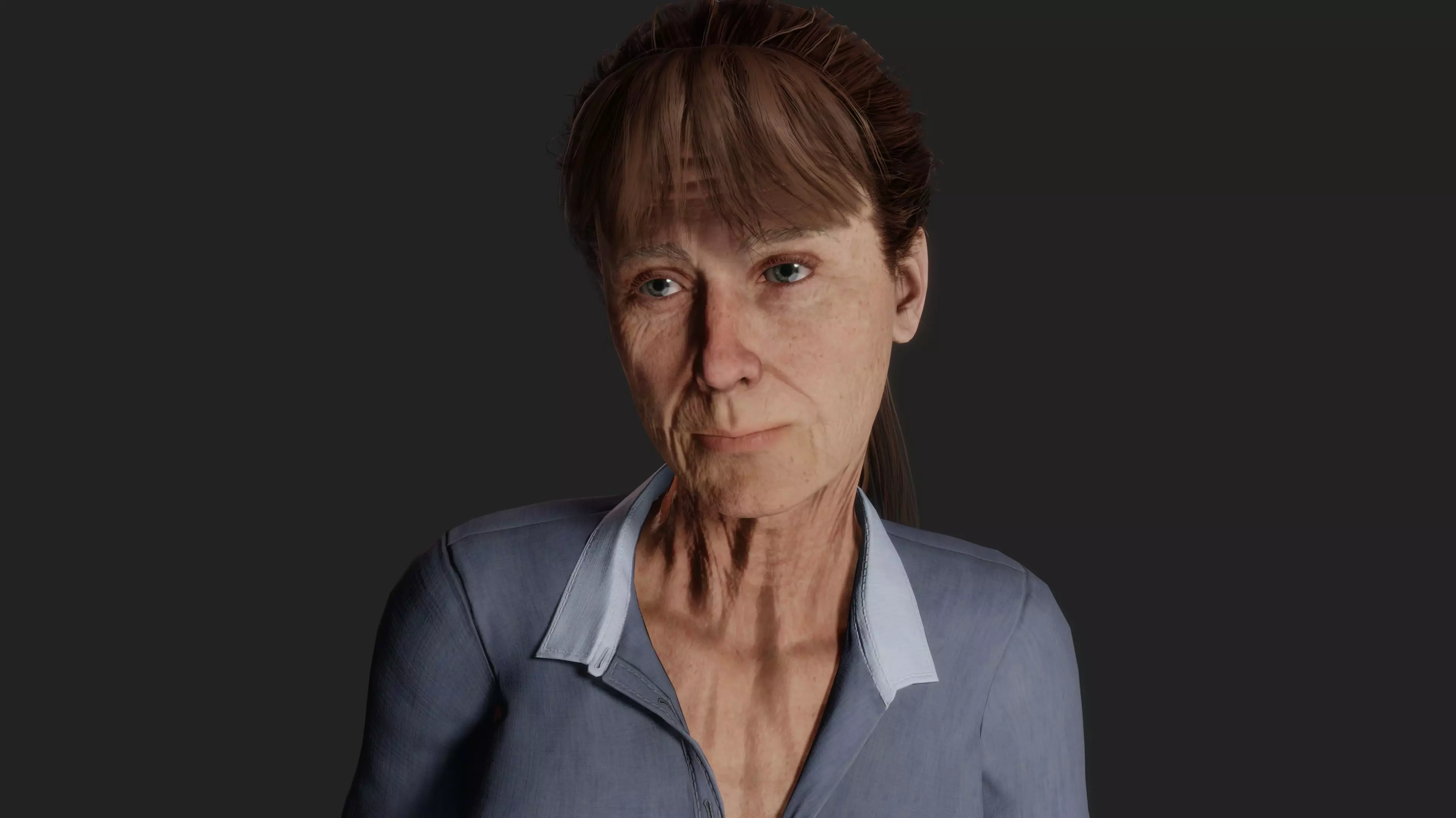 Introducing a meticulously crafted 3D model of an elderly woman exuding grace and character. This lifelike depiction captures the essence of aging with dignity and charm. With subtle details meticulously rendered, the woman possesses a timeless beauty that belies her years. Her brown hair, delicately thinning with age, frames a face adorned with intricate wrinkles, each line telling a story of a life well-lived.