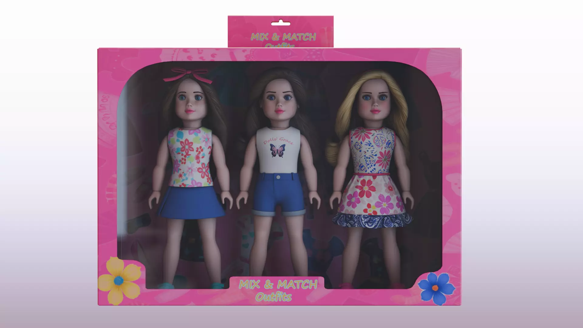 Doll Clothes Set 3D Model : A trendy and fashionable doll clothes set that includes various outfits and accessories. The clothes are made from high-quality fabric and come in different colors and patterns. The packaging features a clear window to display the clothes and a graphic showing the different outfit combinations.