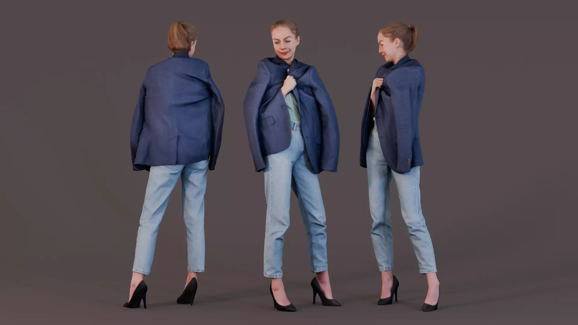 This 3D model depicts a young woman casually wearing an oversized navy blazer, giving a stylish yet relaxed vibe. She pairs the blazer with light-washed jeans and classic black heels, combining comfort and sophistication. Her cheerful expression and confident stance make her a versatile addition to any lifestyle, fashion, or casual-themed projects.