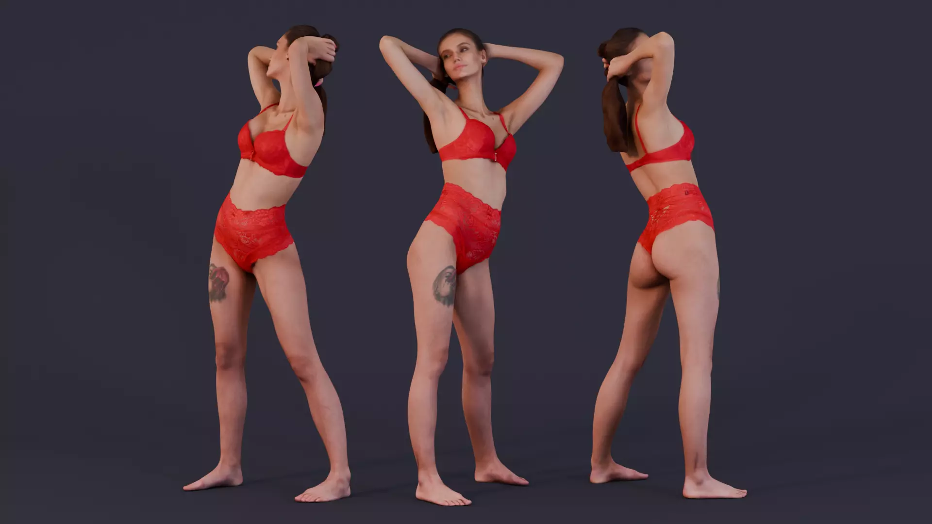 This 3D model features a confident woman in elegant red lace lingerie, striking a graceful pose that showcases her natural beauty. The intricate lace detailing and tattoo accentuate the model's sophistication, making it ideal for fashion or lifestyle-themed visualizations. Her poised stance exudes confidence and allure, suitable for high-end projects.