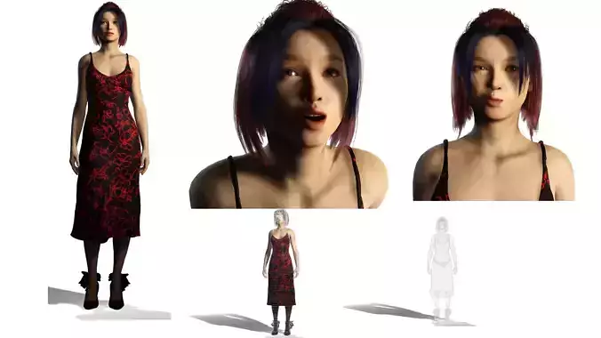 Her long evening dress showcases realistic cloth behavior, natural fabric folding, physically accurate surface shading, and optimized UV mapping. The garment flows naturally with motion, allowing stable deformation during animation and motion capture workflows. The hairstyle and facial detailing are engineered for photorealistic results in both cinematic and interactive environments.