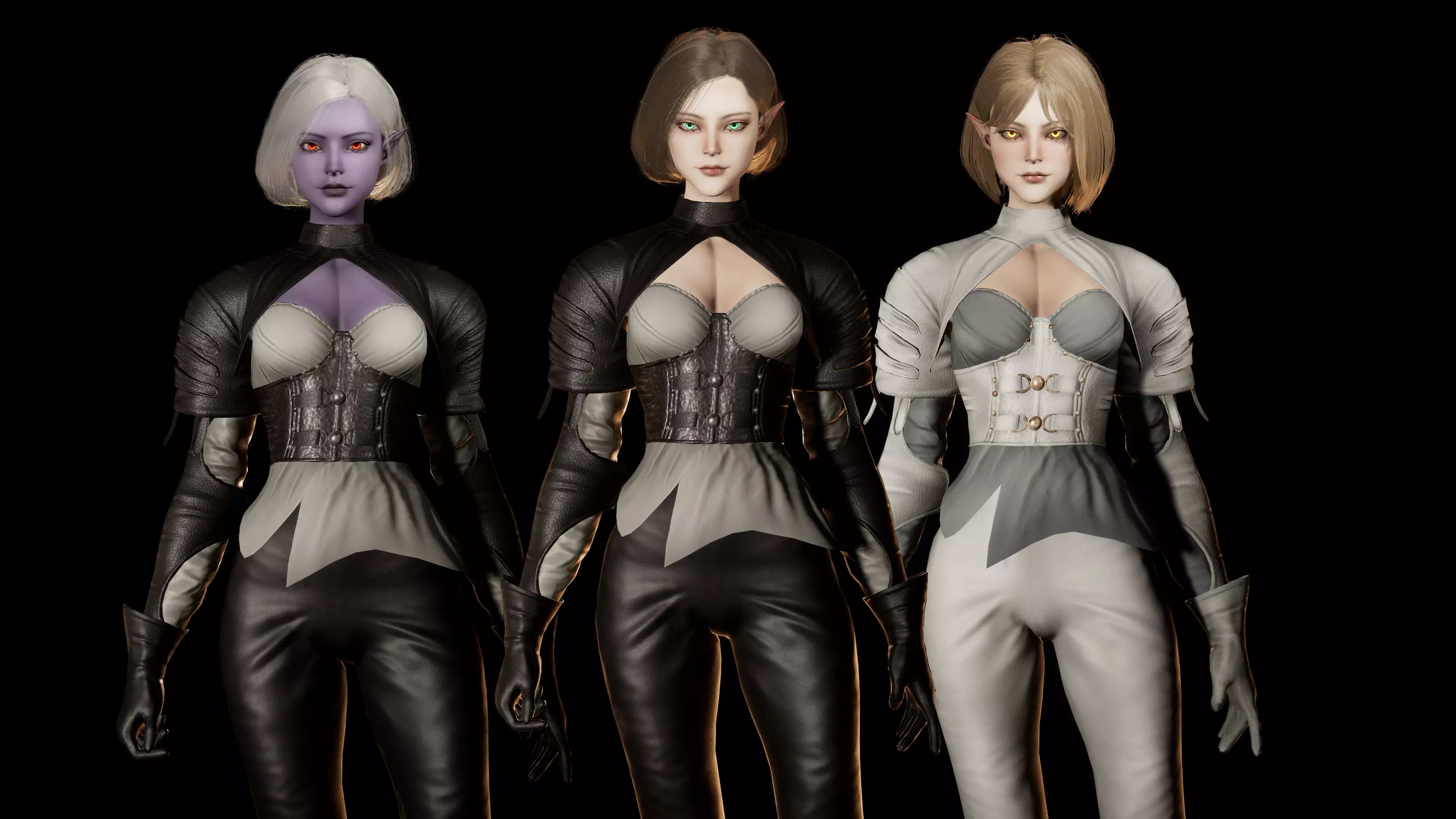 Elf girls have two unique short hairstyles with three unique colorsthe and ability to change colors.One has a dark skin color, one has a white with various additions (redness of the face, freckles).Three different colors of a set of underwear with the ability to change the color.Three unique clothing colors with the possibility of color changes.There are additional options for replacing some things and the body.The project includes models with ready-made unique images: