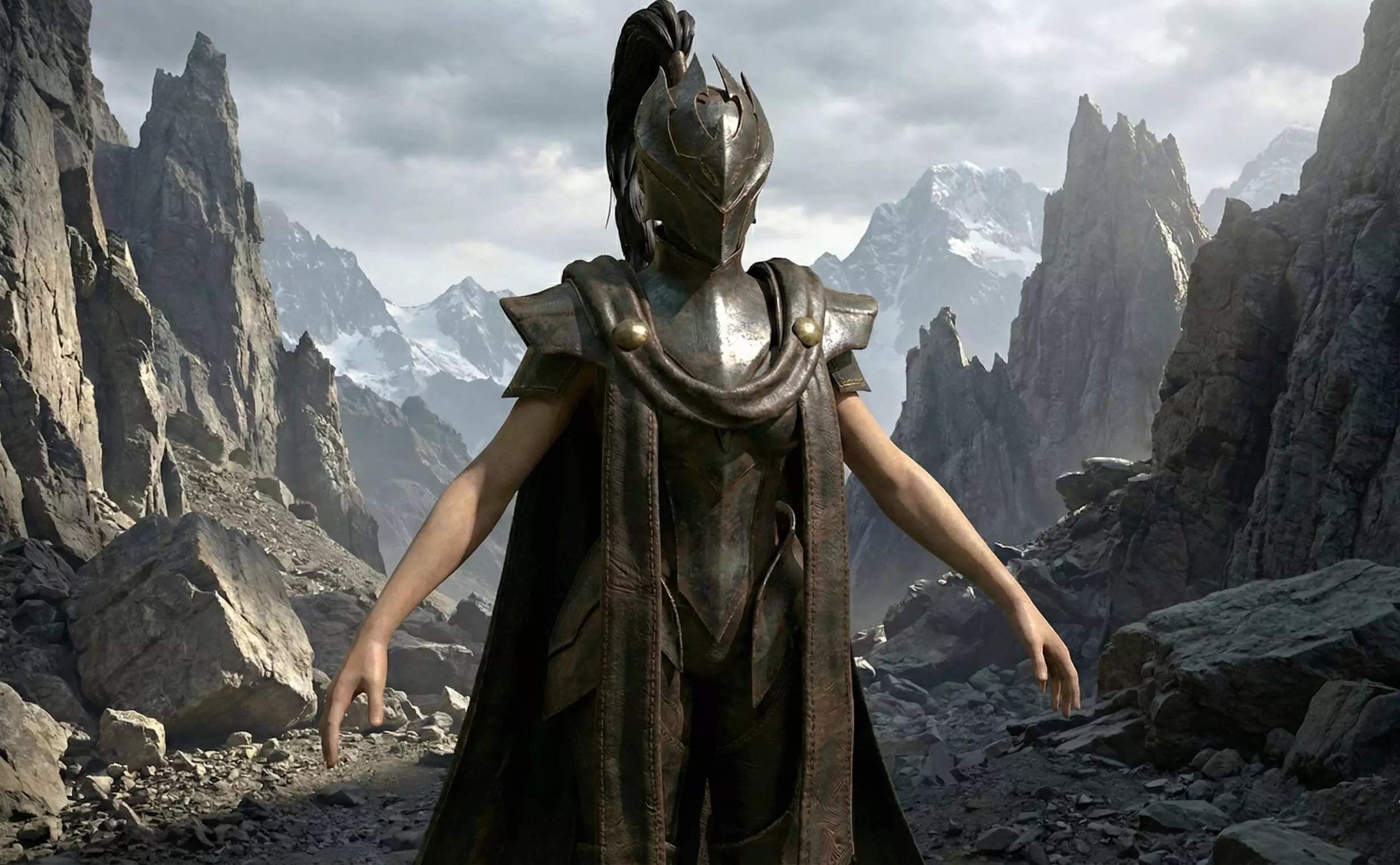 This is a high-quality, heavily armored female warrior base mesh, perfect for high-fantasy RPGs, cinematic animations, or as a foundation for character sculpting. The design features a majestic paladin aesthetic with full-body plate armor, a stylized winged helmet, and a long, dramatic cape draped over the shoulders.
