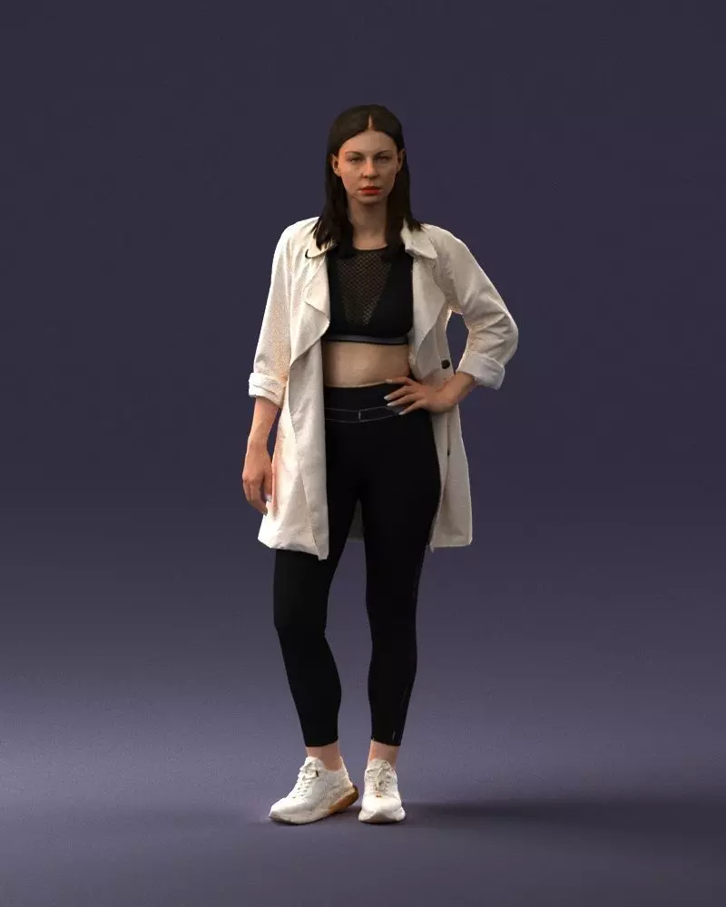 A realistic 3D model of a woman standing confidently, dressed in a light open coat, black crop top, leggings, and sneakers. The model captures a natural, relaxed pose and lifelike proportions, making it perfect for urban, casual, or lifestyle scenes.Created using advanced 3D scanning technology, this digital human asset delivers high-quality realism with accurate surface details and realistic clothing folds.Ideal for architectural visualization, advertising, fashion renders, cinematic scenes, and professional projects requiring realistic human characters.