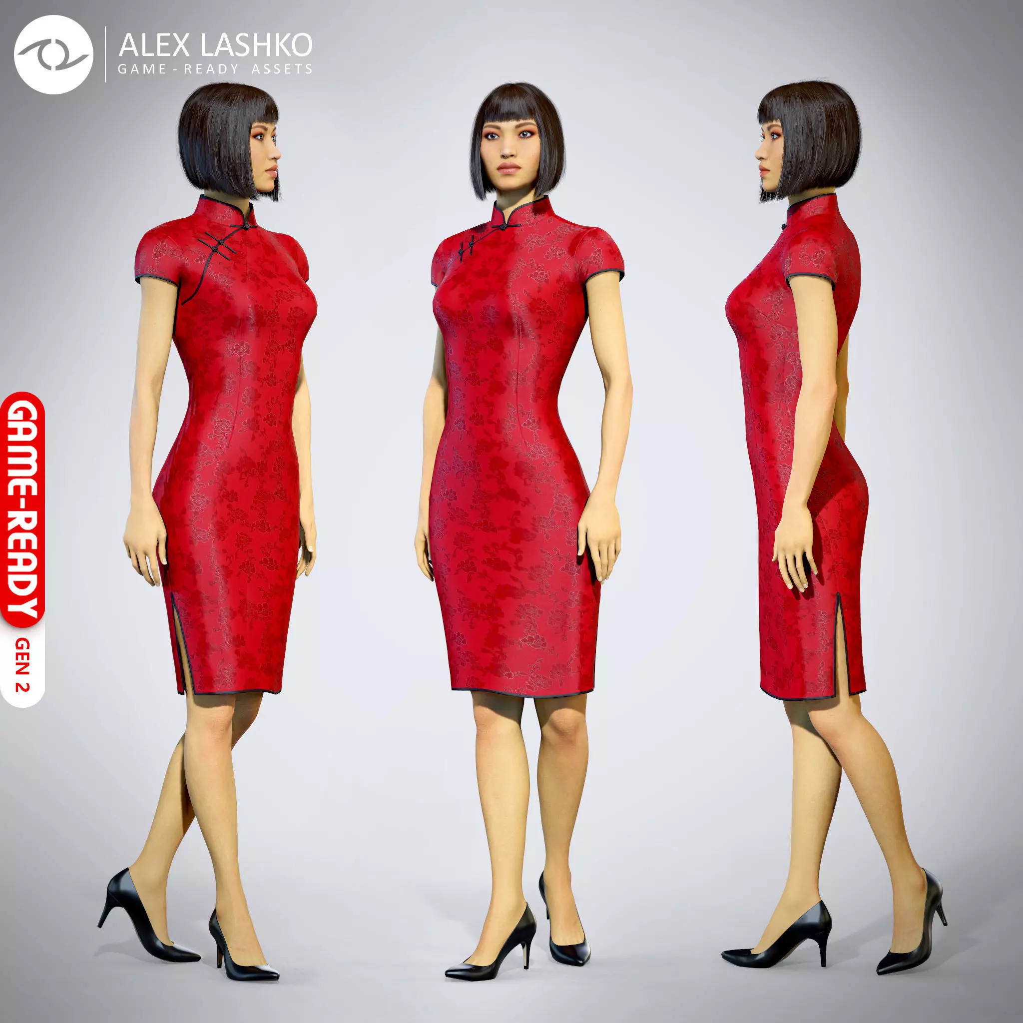 Iva Chinese Dress Female Character Real-Time Game-Ready 3D ModelThis is a high quality realistic asset made for Real-Time engines using PBR technology as seen in many modern AAA games. It can be used in cinematics or can be simplified for mobile use.