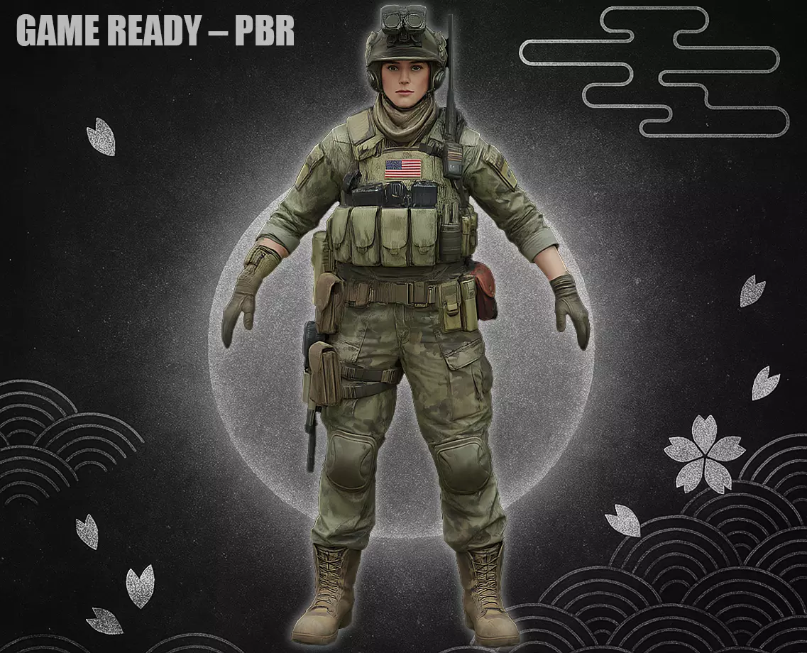 A highly detailed game-ready 3D model of a modern tactical female soldier, designed for realistic military, combat, and narrative-driven game environments.