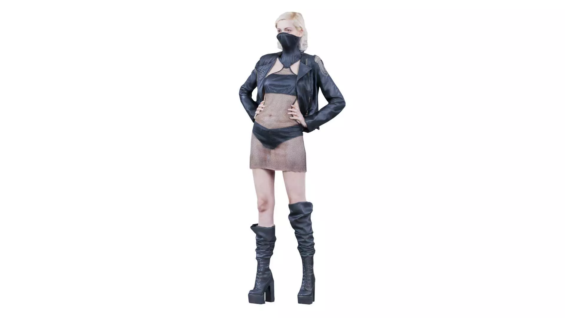 3D scanned model featuring a woman in a leather outfit and boots. This model, fetish woman in fishnet dress and boots, has been created using photogrammetry from a real world object.The raw scan data has been cleaned, retopologized and UV-unwrapped using Zbrush. The result is a low poly mesh with baked maps. The .obj and .mtl are configured so that maps will load automatically in the shader (tested in Blender). In addition, a Blender scene is provided with the model and shader already set up for rendering and export. Detailed information below: