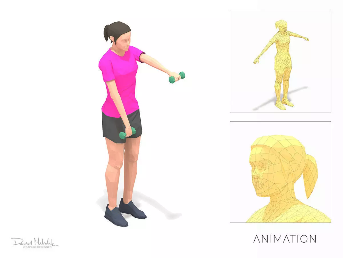 Animations of exercise woman Low poly3d model in flat surface style.Animation created in CAT system and exported to FBX files for loop sequence.Extra textures as bonus