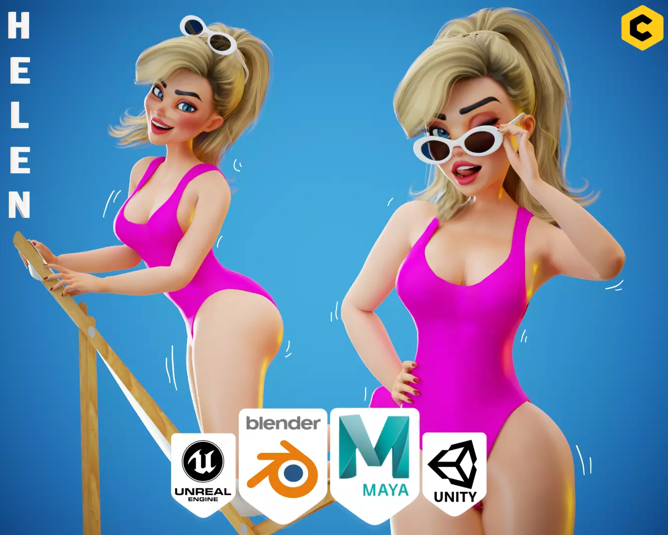 Game Sexy Cartoon Barbie Girl Character rigged - Helen Low-poly 3D model