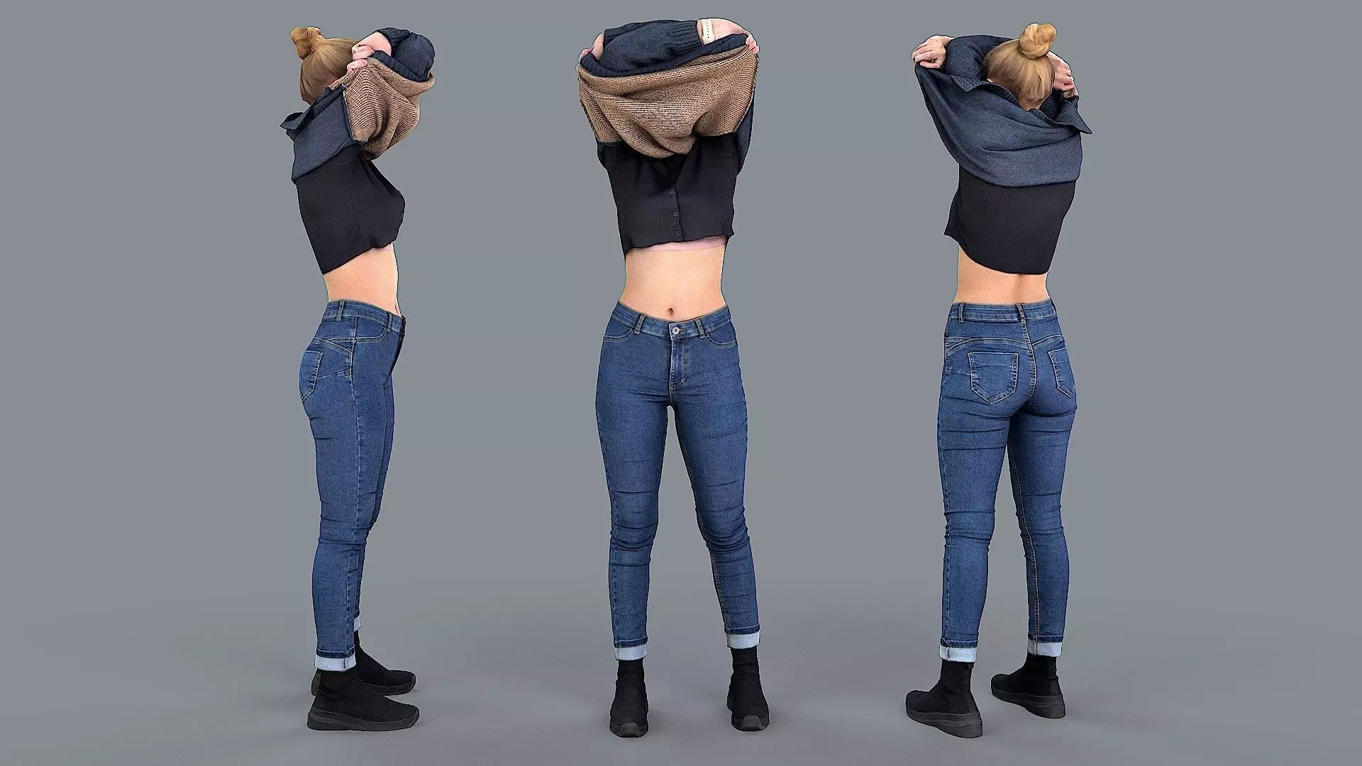 The petite blonde pulls her jumper over her head, revealing her belly and navel. The sweater completely covers her face, she remains in blue skinny jeans, a blue button-down top and black platform boots. Her hair is pulled back into a tight bun.
