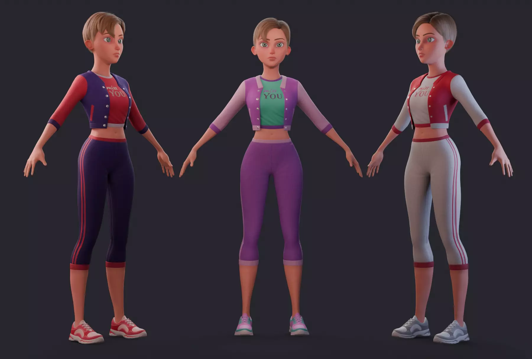 Full rigged and animated model is here: https://www.cgtrader.com/3d-models/character/woman/girl-in-the-sport-suit-stylized-rigged-and-animated