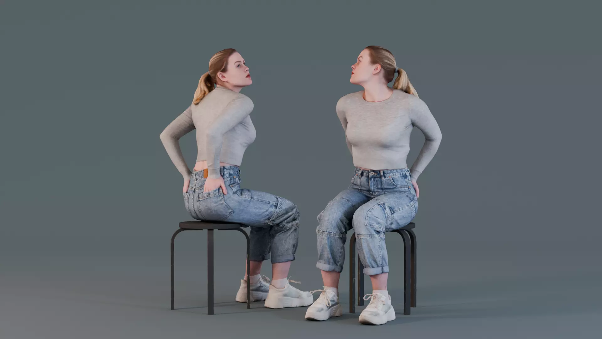 This 3D model captures a young woman seated, waiting in a relaxed yet attentive pose. She’s dressed in a simple, casual outfit featuring a fitted long-sleeve top and light-wash, cuffed jeans paired with chunky sneakers. Her posture reflects curiosity or mild impatience, with her hands resting on her sides and a slight backward tilt as she looks upward. This model is ideal for adding realism to scenes requiring a character in a waiting or observing role.