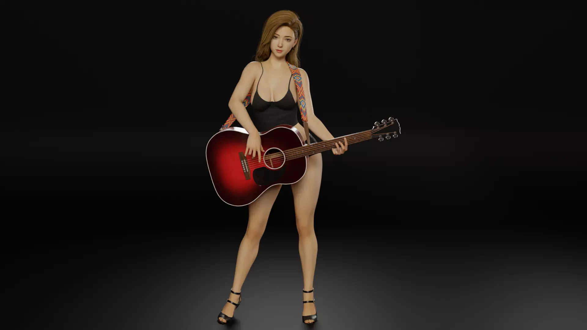 OVERVIEWThe scene contains a rigged female 3d character with a Mahogany Acoustic Guitar and Guitar strap modeled, textured and rendered with attention to detail. The character is highly detailed with 4k textures applied and rigged bones attached and accurately adjusted to the character.