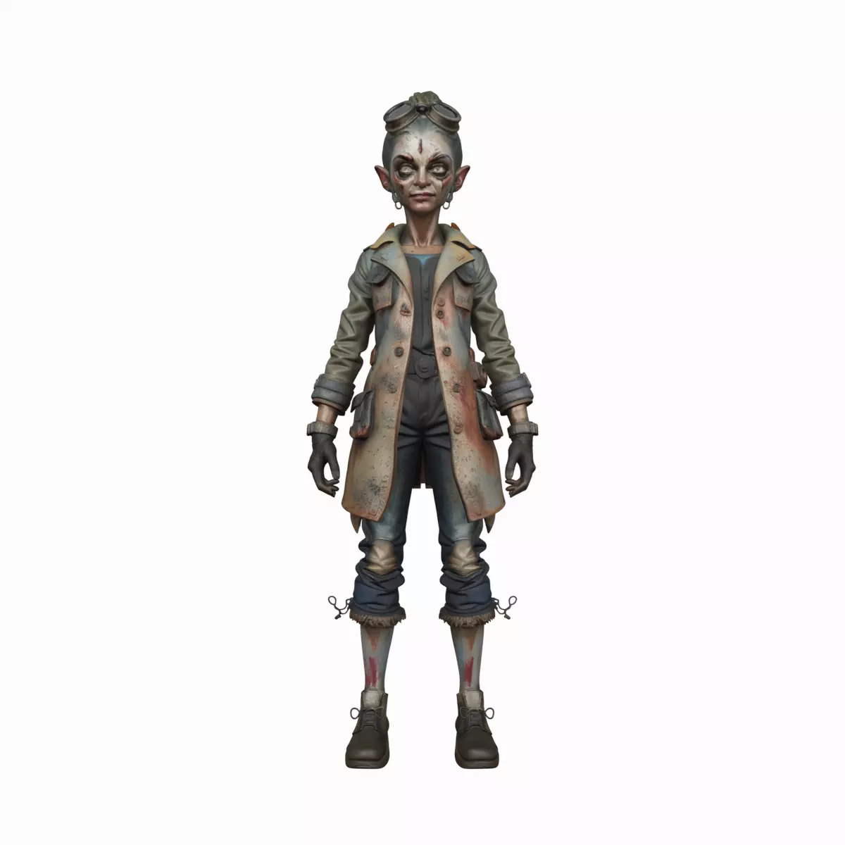 Eccentric undead alchemist from World of Warcraft, featuring decayed skin marred by vivid chemical burns, mismatched yellow glowing eyes piercing through shadowed sockets, and wild, unruly eyebrows framing her gaunt face. Her messy, singed green hair is tied into a haphazard bun, strands fraying like forgotten experiments. She wears a stained and tattered lab coat adorned with numerous potion-filled pockets, paired with patched trousers clinging to bony legs, protective rubber gloves smeared with residues, and oversized goggles perched on her forehead. In one hand, she clutches a bubbling flask with swirling iridescent liquids and rising bubbles, while the other holds a sturdy mortar crusted with alchemical remnants. Every detail captures her scarred, otherworldly essence—precise cloth patches, burn textures, liquid dynamics, and eerie glows—crafted for seamless 3D modeling from front, left, back, and right views, isolated on a clean white background without shadows or extras.