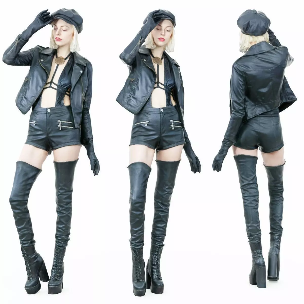 Cute girl for 3D rendering or Augmented & Virtual Reality: Hot Girl in Black Leather Boots jacket Hat
