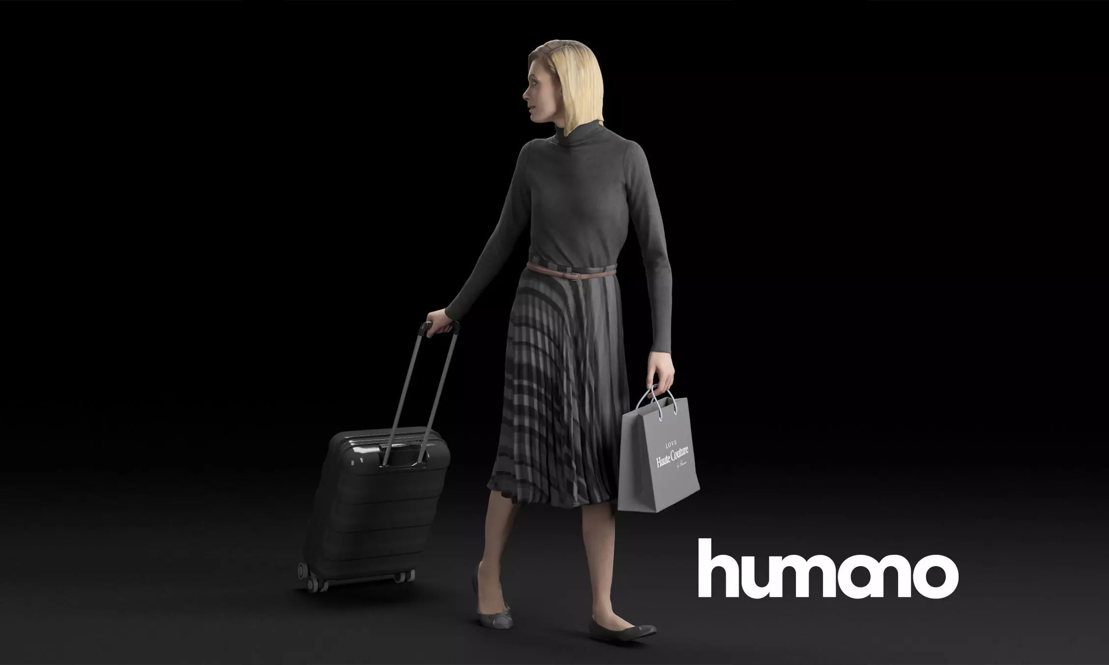Humano Elegant woman in skirt walking with a suitcase 0309 3D model