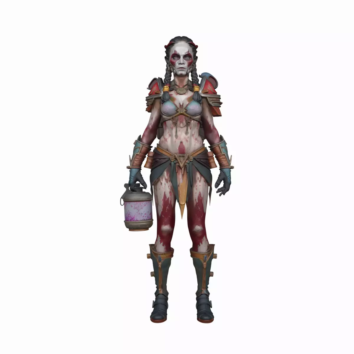 Undead Plaguebringer in World of Warcraft StyleThis menacing undead plaguebringer embodies toxic horror with her corroded, pale flesh riddled by festering wounds that ooze viscous green slime, her piercing yellow eyes glowing with malevolent intensity beneath a ragged respirator mask. Strands of braided black hair, adorned with sinister toxin beads, cascade wildly around her gaunt face. She dons intricately detailed plague armor featuring rusted vents spewing ethereal mist, bulky gloves equipped with dripping nozzles, and heavy hazmat boots caked in grime. A cumbersome backpack sprayer clings to her back, connected by hoses to the canister she wields dramatically, posing as if unleashing a catastrophic plague upon the world. Every element, from the textured wounds and fluid ooze drips to the mechanical vent details, is rendered with hyper-realistic precision for seamless 3D modeling, capturing her four-view composite essence on a stark white background.