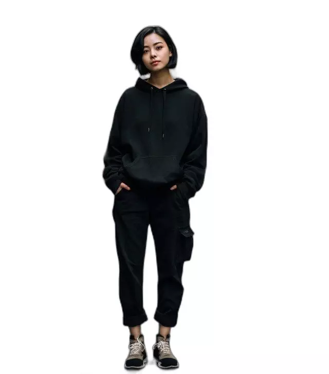 Get ready to take on the streets of Shibuya with our fierce 28-year-old Japanese beauty! Basking in the warm glow of a sunny day, she effortlessly rocks the tomboy style. Sporting an oversized black hoodie, edgy cargo pants, and high-top sneakers, she's the epitome of cool and casual.
