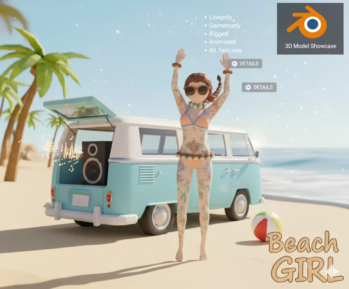 Feature DetailModel Type Character (Beach Girl)Geometry Low-Poly, Optimized MeshRigging Yes, Standard Character RigAnimations Included (e.g., Idle, Walk, Dance)Texture Resolution 4096x4096 (4K)Formats .blend, .fbx, .objEngine Support : Unreal Engine, Unity (via FBX)