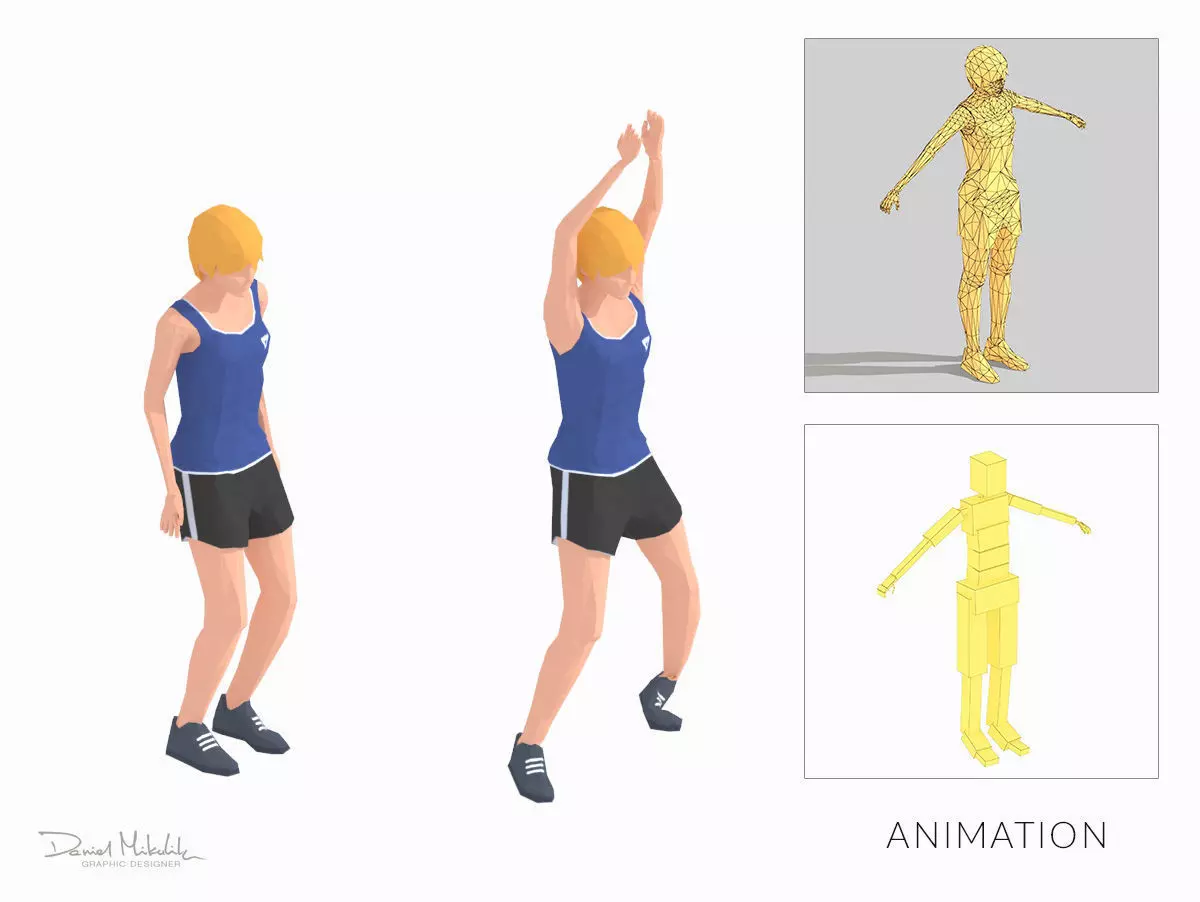 Animations of exercise Woman Low poly3d model in flat surface style.Animation created in CAT system and exported to FBX files for loop sequence.Extra textures as bonus