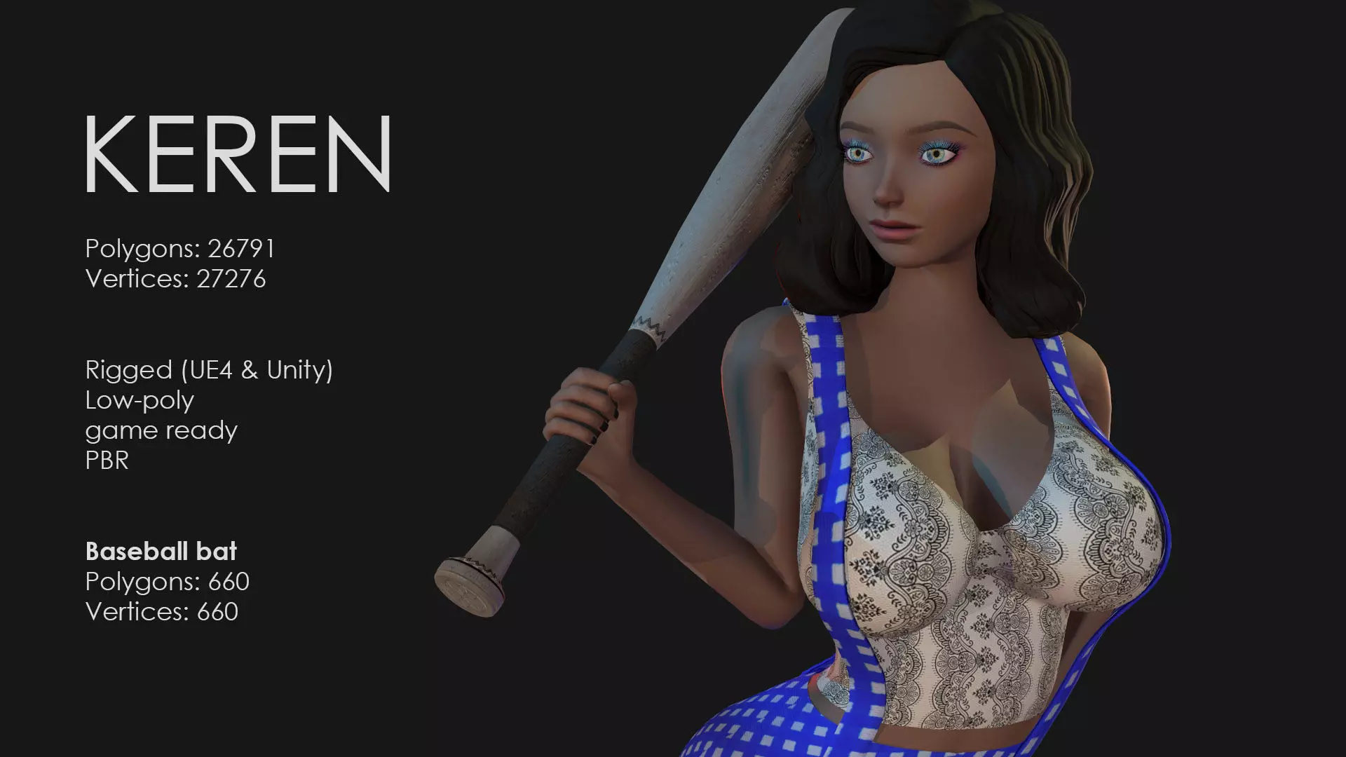 PBR textures [Metallic\Roughness]Body/Head: 4096x4096 (OpenGL) .TGA format.Сlothes: 1024x1024 (OpenGL) .TGA format.Eya: 2048x2048 (OpenGL) .TGA format.Baseball bat: 1024x1024 (OpenGL) .TGA format.