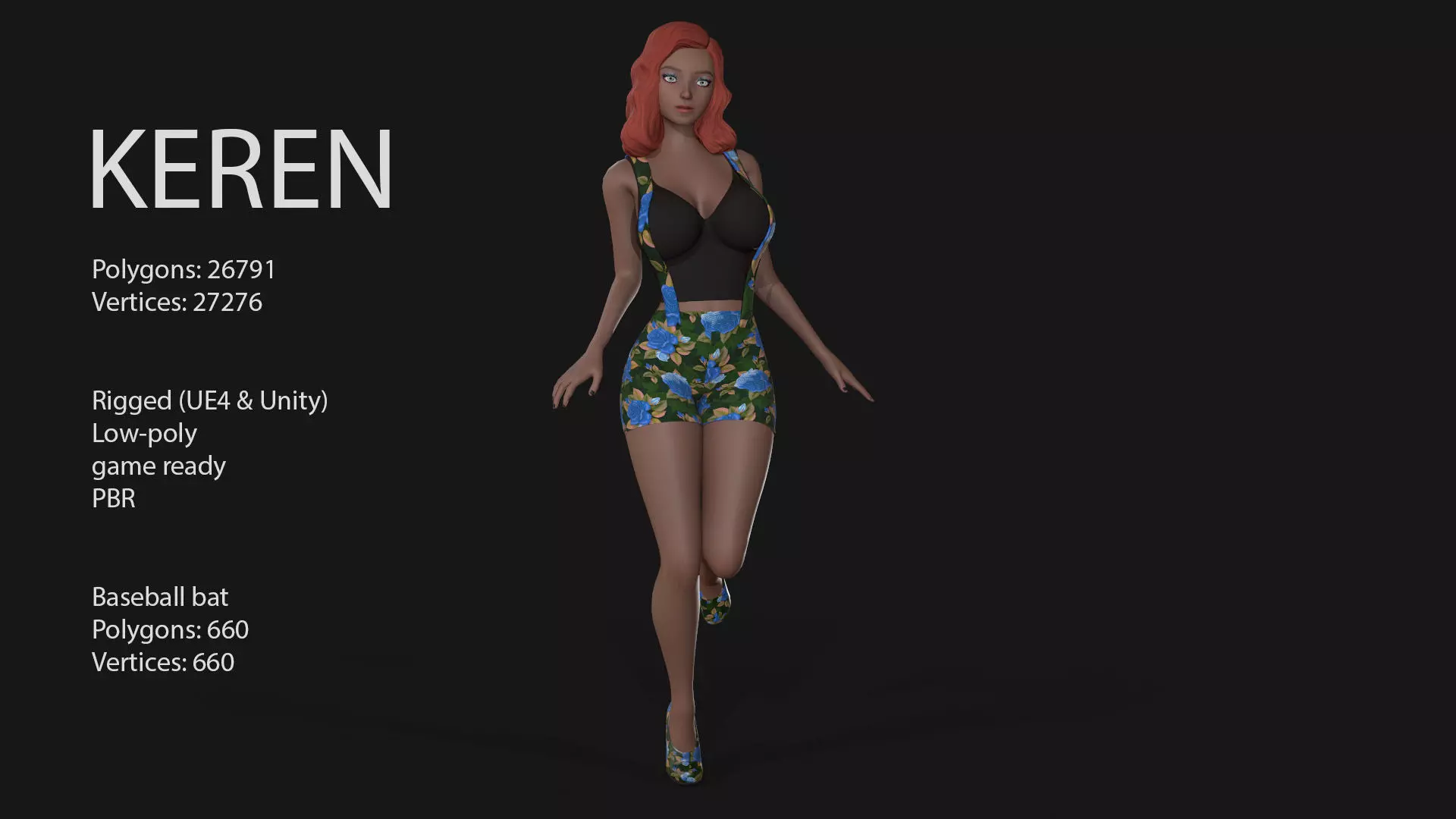 PBR textures [Metallic\Roughness]Body/Head/Сlothes:: 4096x4096 (OpenGL) .TGA format.Eya: 2048x2048 (OpenGL) .TGA format.Baseball bat: 1024x1024 (OpenGL) .TGA format.