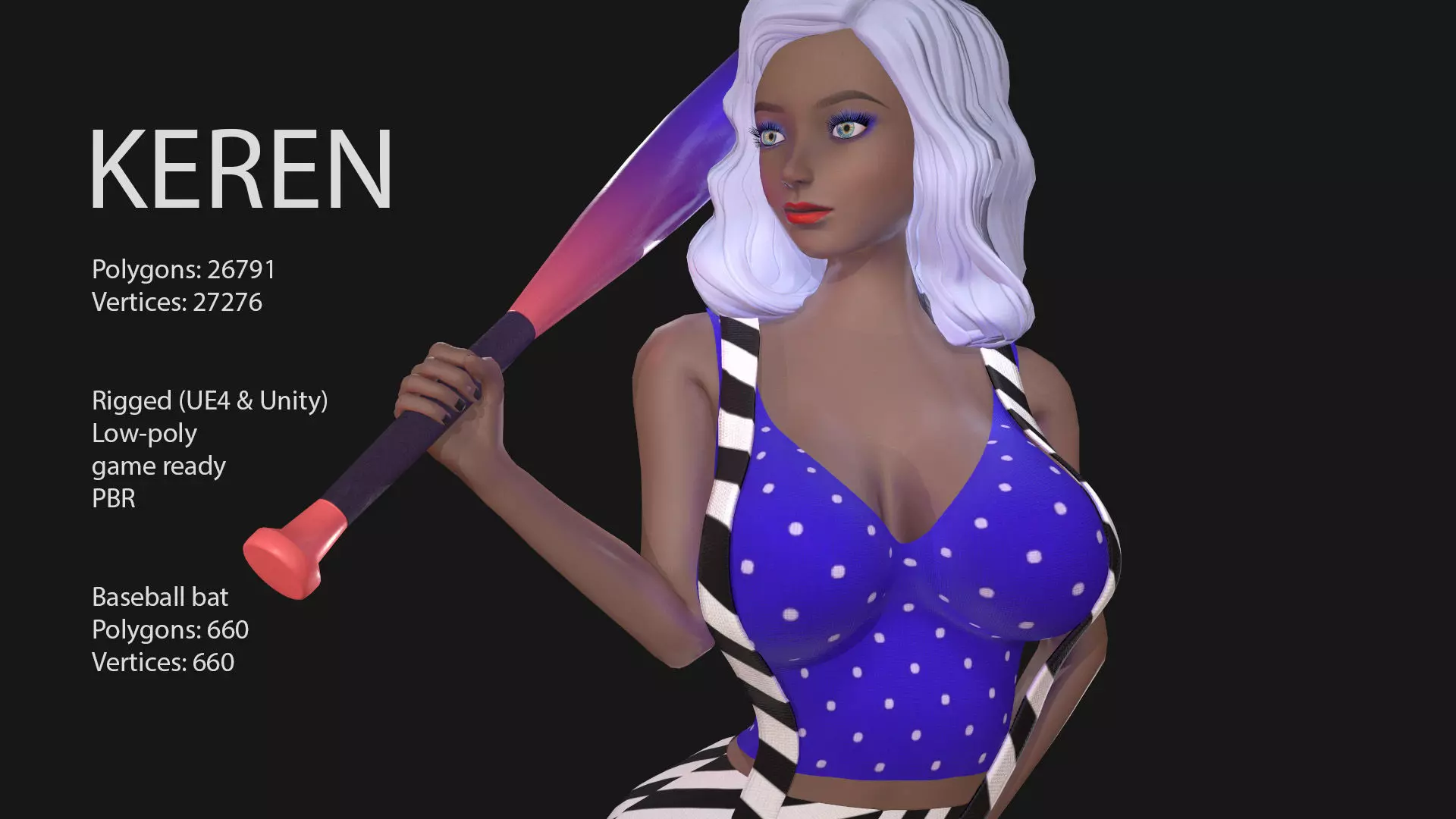BaseMash and Rig file (.fbx)Animation running (.fbx)PBR textures [Metallic\Roughness] Body/Head/Сlothes:: 4096x4096 (OpenGL) .TGA format. Eya: 2048x2048 (OpenGL) .TGA format. Baseball bat: 1024x1024 (OpenGL) .TGA format.