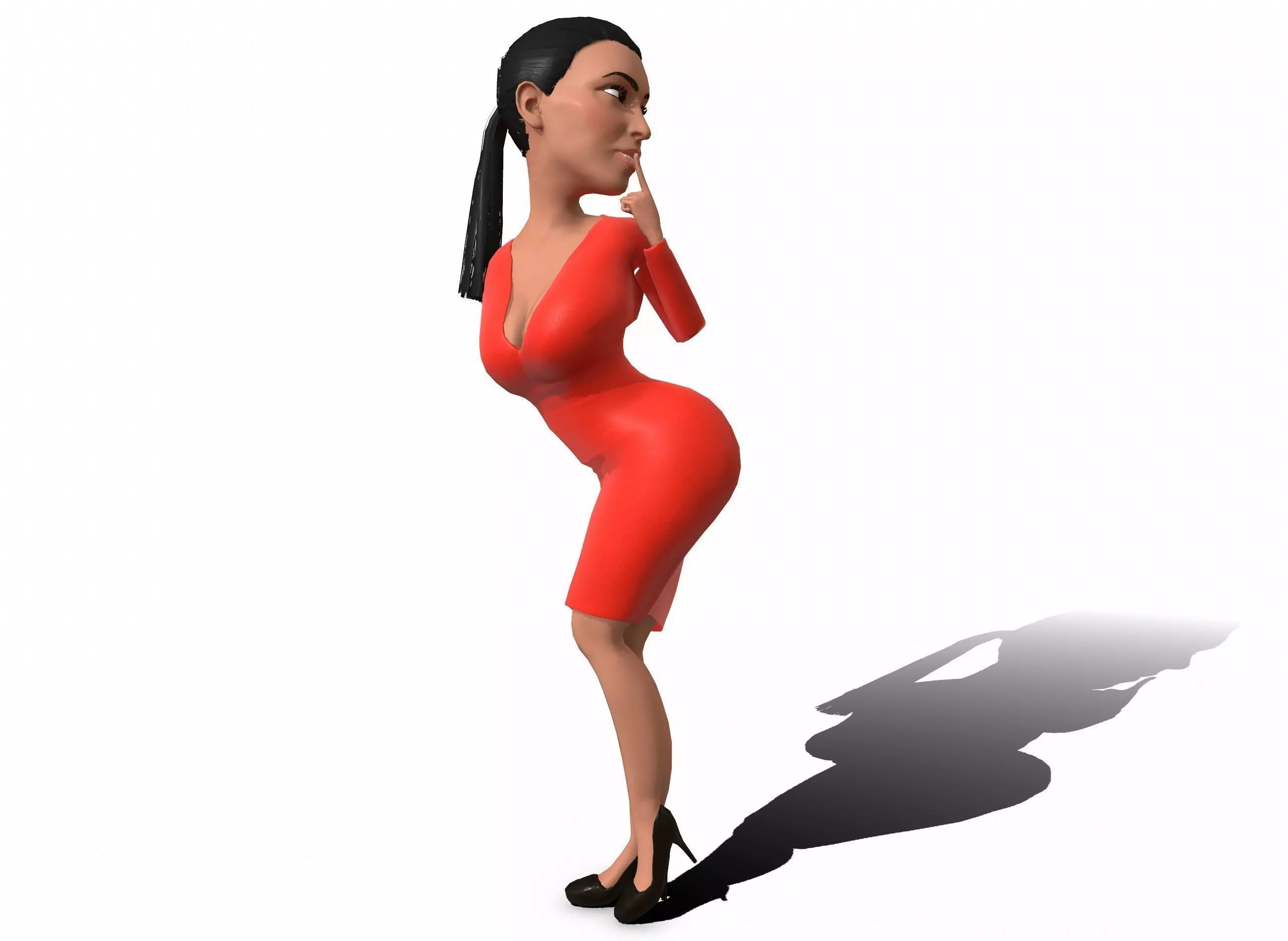 Stylized caricature of Kym Harashian East. Character is low poly, rigged, animated, PBR. Character is stylized artistic 3D model.