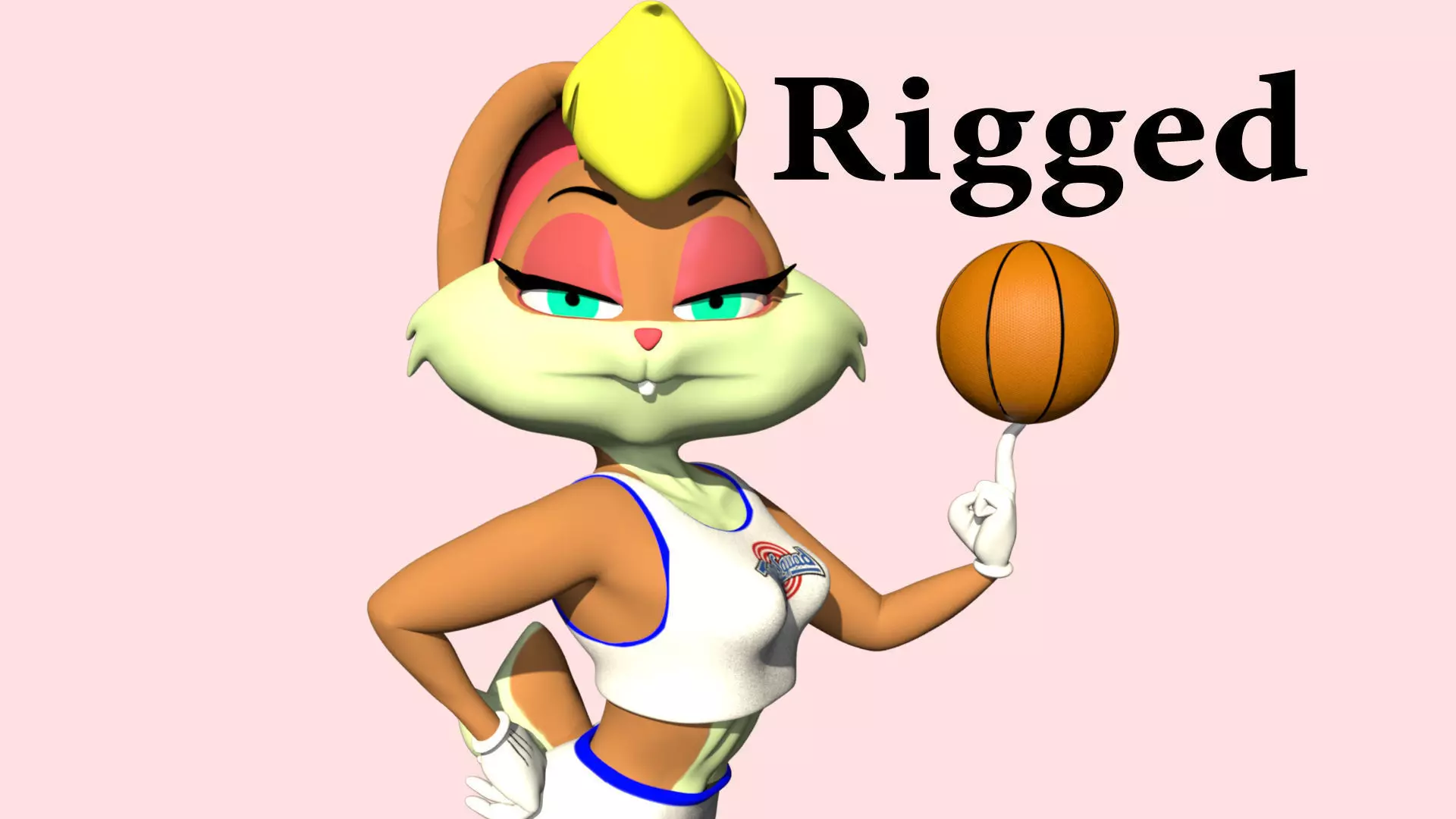 This is a 3D model of Lola Bunny, character based on a Looney Tunes universe (rigged body, rigged clothes, rigged face)