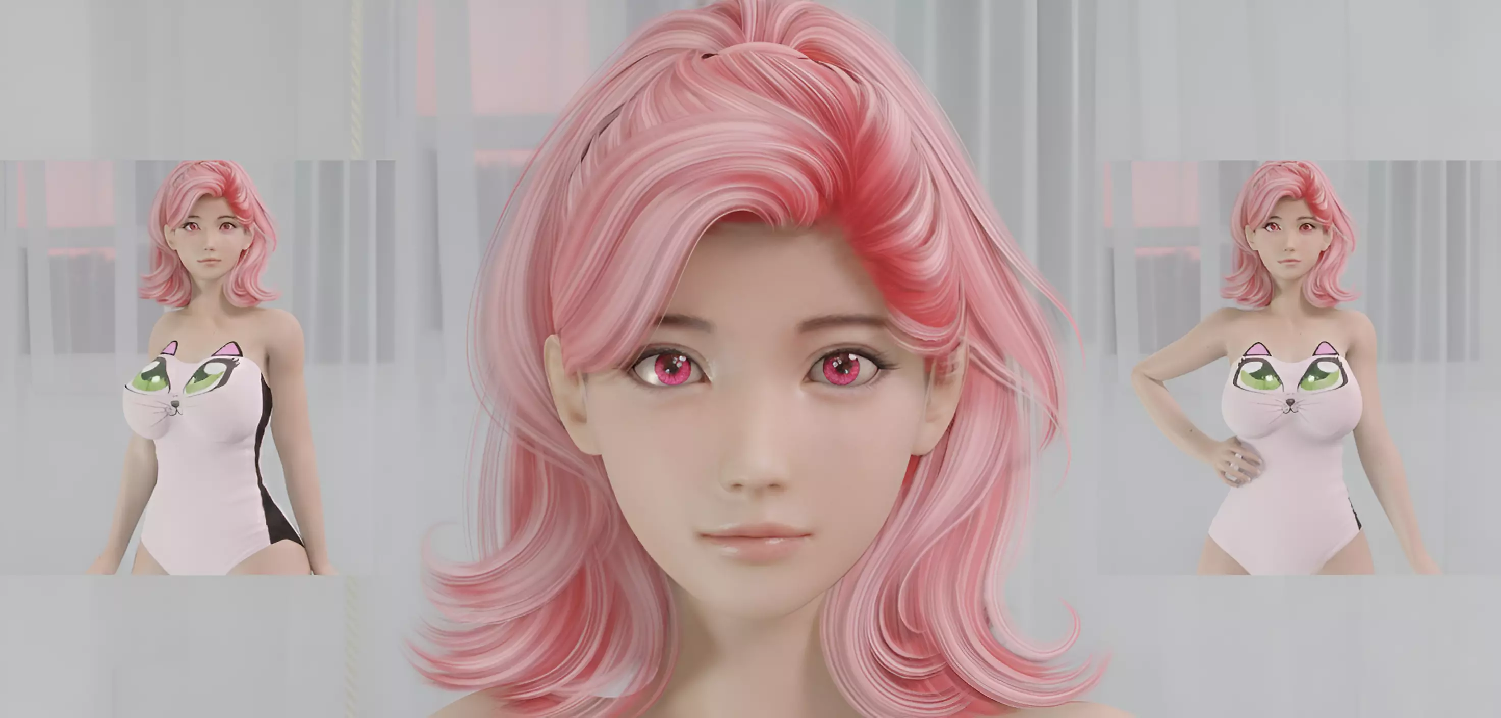 Stylized look with pink hair, pink eyes, and pink dress