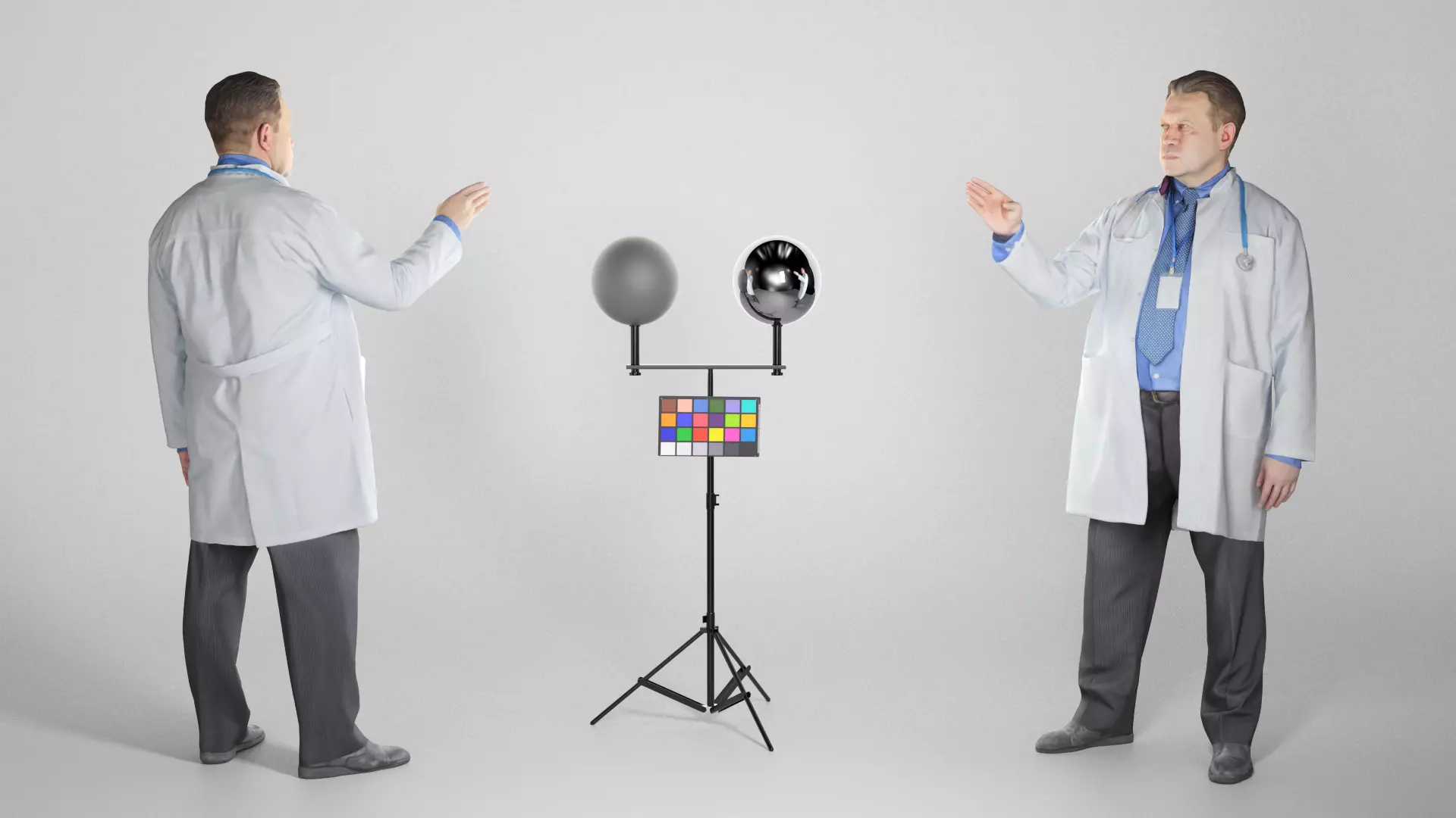 This is a true human size and detailed model of an adult man of Caucasian appearance dressed in a surgical uniform. The model is captured in typical professional pose to perfectly match a variety of architectural and product visualizations, be used as a background or mid-sized character in advert banners, professional products/devices presentations, educational tutorials, VR/AR content, etc.