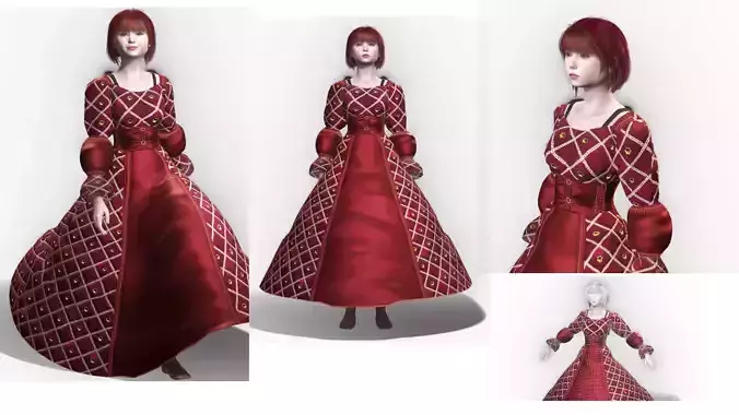 Her facial structure, hair styling, and proportions are built for close-up renders, cinematic animation, VR experiences, and promotional artwork. The gown demonstrates realistic cloth flow, fold behavior, and surface response under lighting, making this asset ideal for medieval environments, royal court scenes, fantasy RPGs, and historical cinematics.
