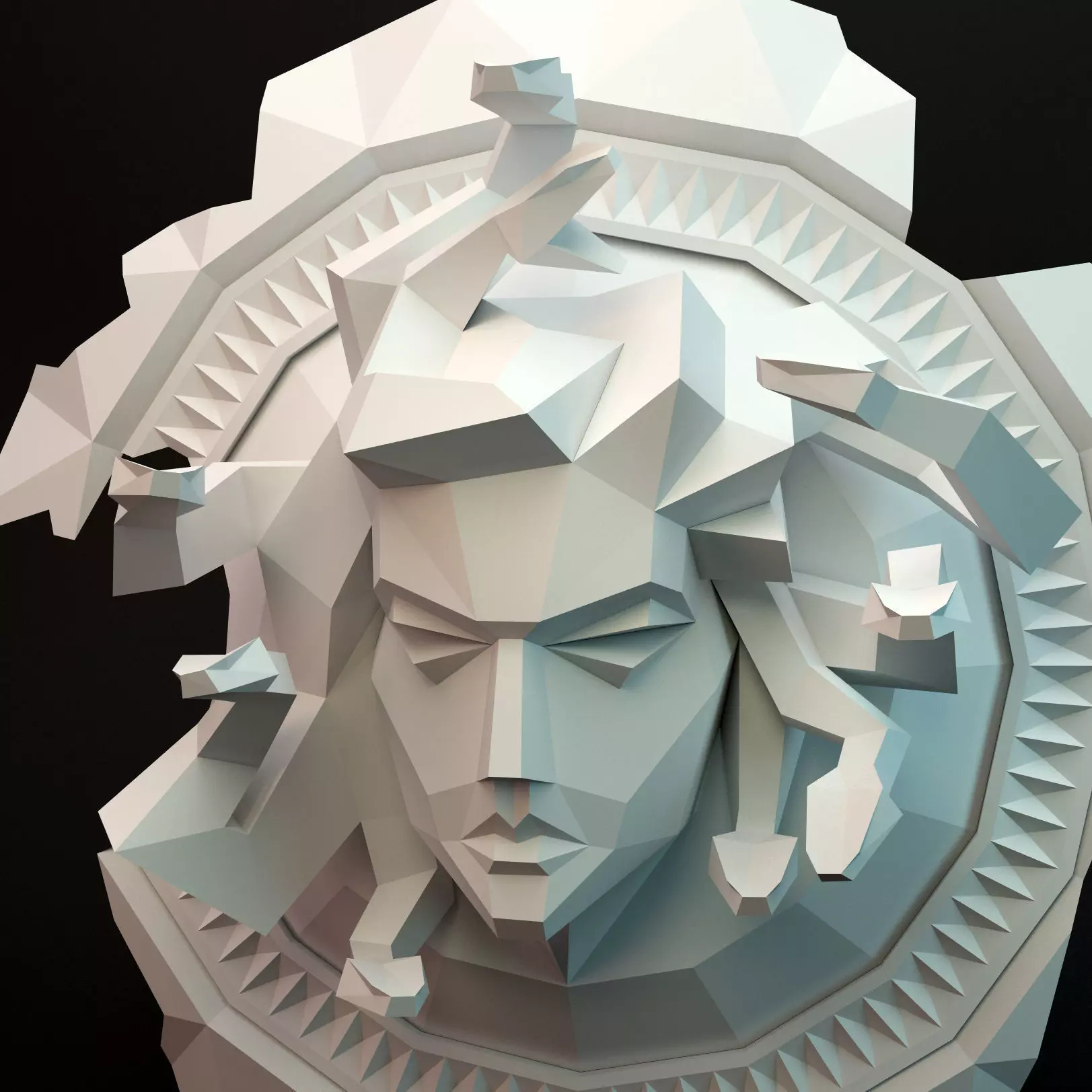 Low poly 3D model of Medusa Gorgona's head with geometric facial features and snake hair. Simplified facial traits and striking snakes in a minimalist style create a unique and stylized representation of the mythological character. Perfect for low poly projects or games.